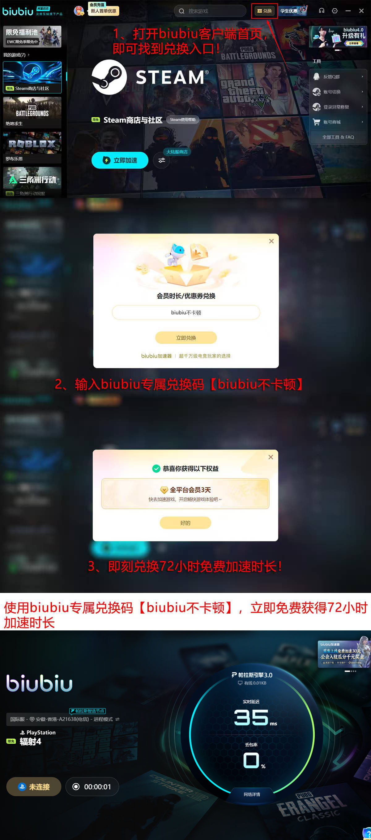 大家在玩辐射4的时候,无论是登不上的问题,还是玩游戏遇到的掉线、掉帧等,都可以先试用biubiu的加速效果,目前有免费时间可以领取,一个是注册时系统送到账户上的24小时,一个是登录后,在首页兑换功能处,使用【biubiu不卡顿】口令,换到的72小时,总计有96小时。