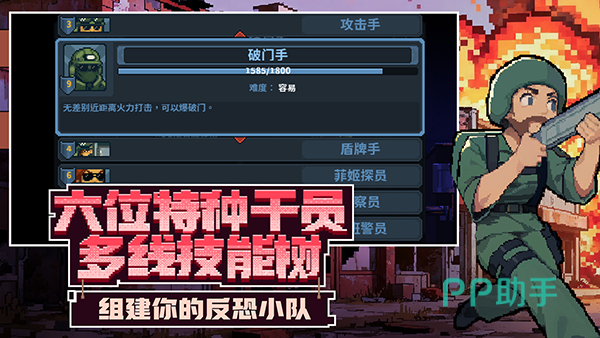 《破门而入行动小队》设计了6位搭载了独特天赋技能树的枪战角色,并依托于独树一帜的像素化设计,游戏构筑了各种辨识度极高的横版战斗场景,通过60余种投掷、射击相结合的武器装备配置,让大家扮演着英勇无畏的反恐队员,迈入到地图中,各种攻击机制令人胆寒的对手进行开火交锋。