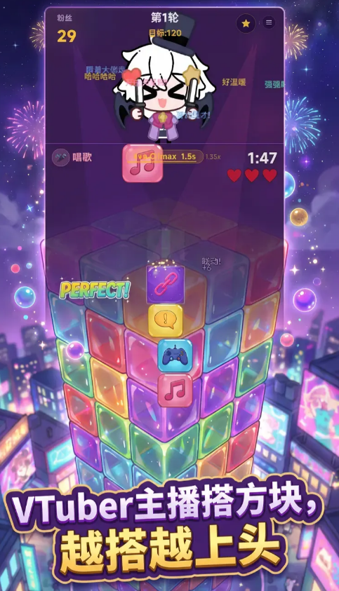 视听体验方面,游戏内置多套动态BGM系统,随直播热度实时切换——进入狂热状态后自动激活专属高燃音轨,配合实时增长的粉丝数可视化反馈,强化临场直播沉浸感。背景音乐支持手动调节,适配不同操作节奏与情绪偏好。每局对战结束后,玩家可在30多种强化效果中三选一,持续优化自身流派,例如扩大判定范围以提升容错、提高狂热持续时间以延长高分阶段、或增强弹幕互动奖励等。
