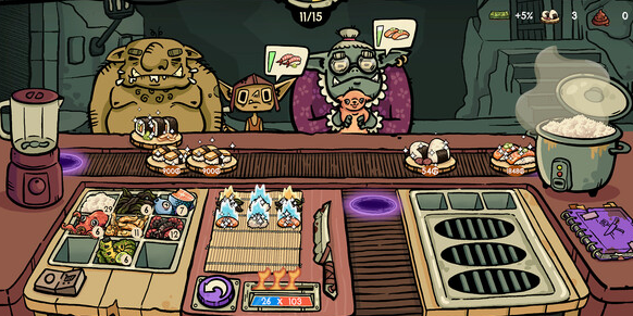 游戏采用高节奏时间管理机制:每位顾客均设有耐心倒计时,超时交付将导致付款金额显著降低。玩家需在有限时间内精准把控流程效率,并通过局内进度解锁三选一强化卡牌——例如“幽灵醋”(使寿司发光)、“双倍金币”或全新寿司配方,逐步构建个性化经营策略,形成兼具策略深度与随机乐趣的肉鸽式成长循环。