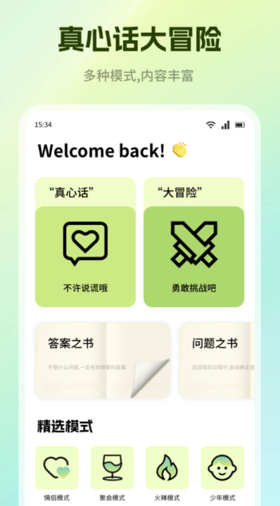 聚焦核心玩法,仅保留“真心话”与“大冒险”两种路径,无多余模式干扰。操作零门槛,适合饭局、团建等即时互动场景。无需记忆复杂指令或养成体系,靠纯粹问答驱动进程,反而强化真实感与临场趣味,拉近参与者心理距离。