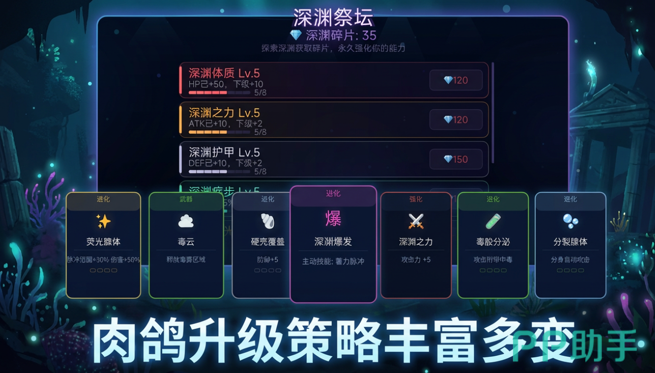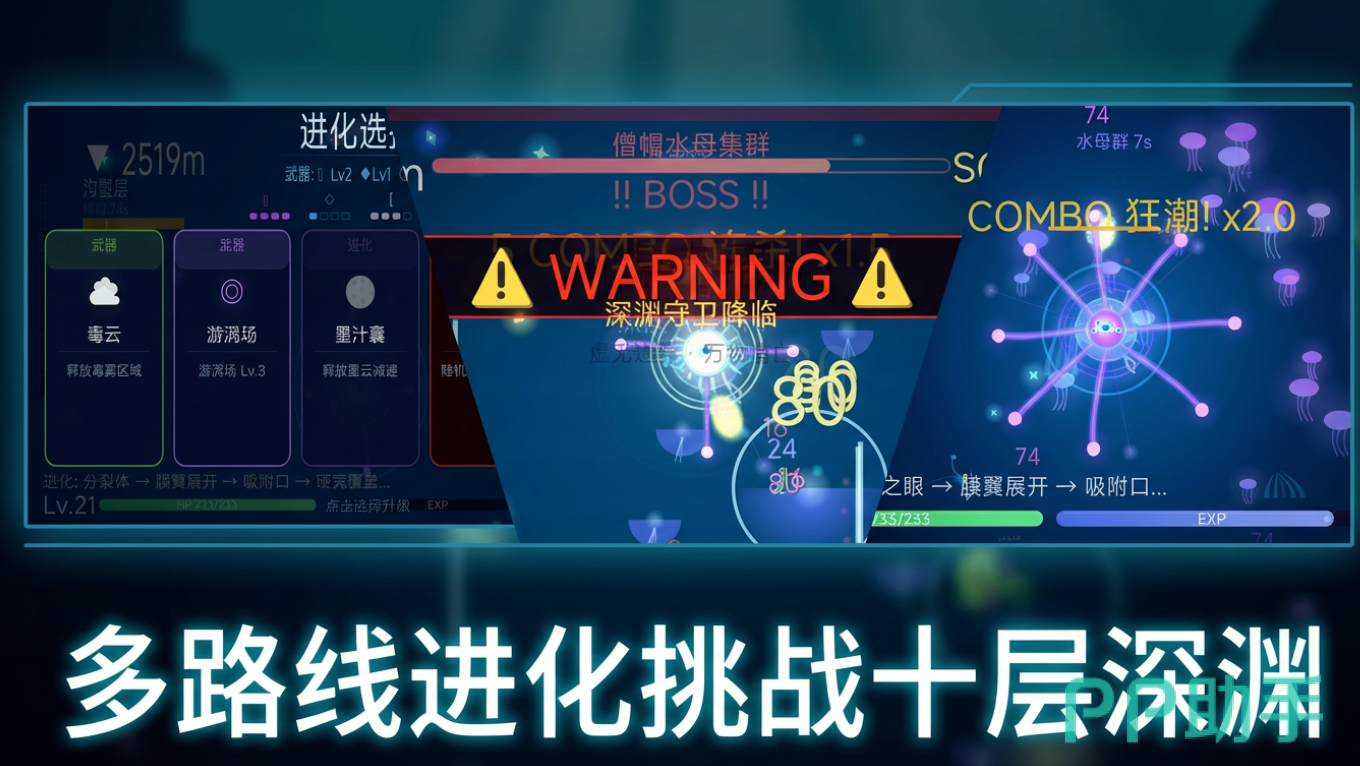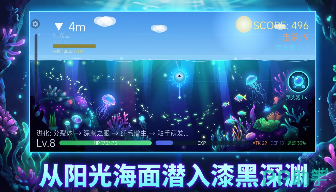 作为一款聚焦深海生态与非线性进化的策略向动作RPG,《荧光深渊》以真实海洋学为灵感,构建出高度拟真的深海环境系统。玩家从微小的自发光原生体起步,通过战斗积累能量,触发关键进化节点。每次升级提供四大核心路径选择:触手系(高爆发范围控制)、甲壳系(高耐久与反伤机制)、毒素系(持续伤害与群体削弱)、荧光系(全屏激光打击与能量过载技能)。每条路线均拥有独立技能树、专属成长数值及差异化战斗反馈,确保单局体验不可复刻。