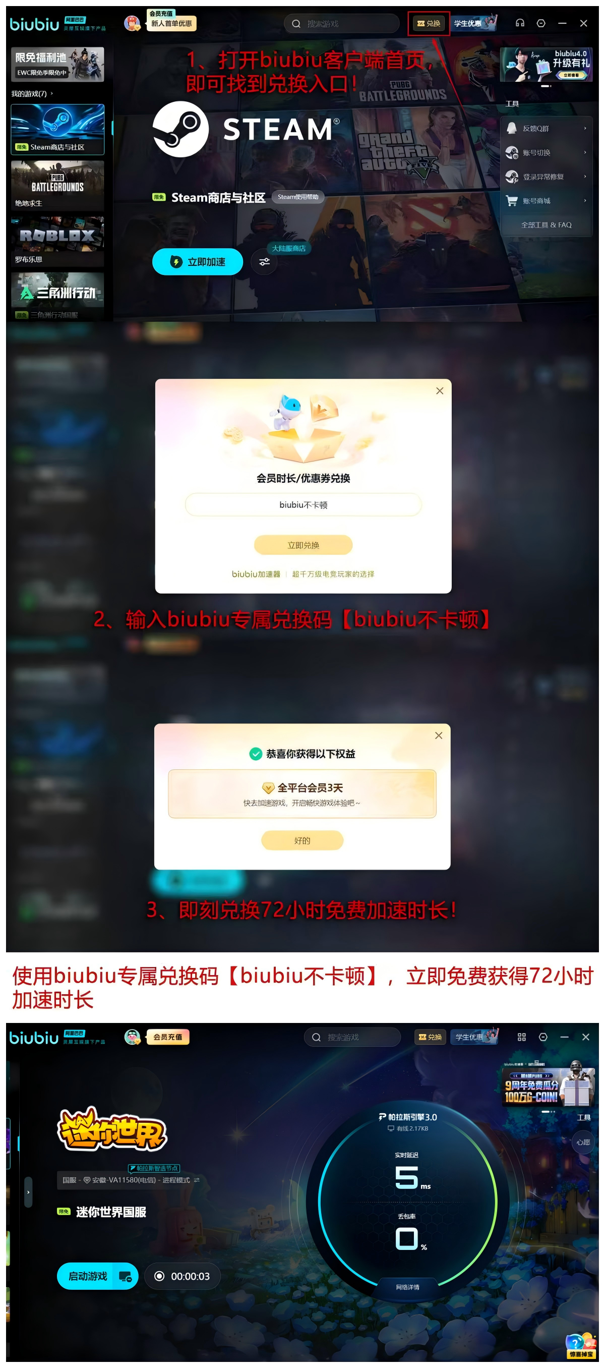 现开放限时福利:输入口令【biubiu不卡顿】即可领取72小时免费加速时长;新注册用户还可额外获赠24小时新手权益,合计达96小时体验周期,便于深度测试各项功能适配效果,再决定是否升级为长期服务用户。