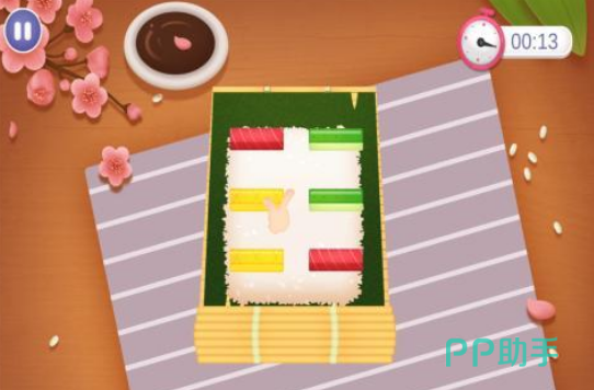 围绕食物制作流程展开生活技能训练,提供海苔、黄瓜、鳗鱼、蟹棒等真实食材模型,支持自由搭配组合,完成卷寿司、握寿司、刺身拼盘等不同品类制作。每种寿司对应独立操作步骤与视觉反馈,强化顺序意识与分类能力,同时融入色彩识别与数量配对等基础数学概念。