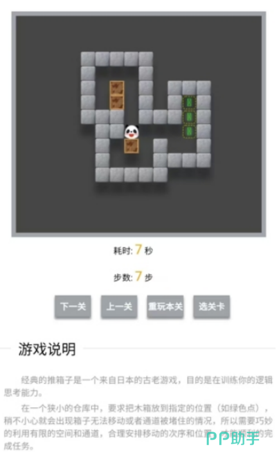 本作以仓库为叙事场景,融合轻剧情与强解谜机制。玩家操控一只萌态十足的小熊猫,在有限空间内推动木箱,目标是将所有箱子精准抵达地图中标记的绿色圆点位置。关卡结构紧凑,障碍布局多变,稍有疏忽即导致箱子陷入死局,充分考验玩家的空间建模与分步推演能力。