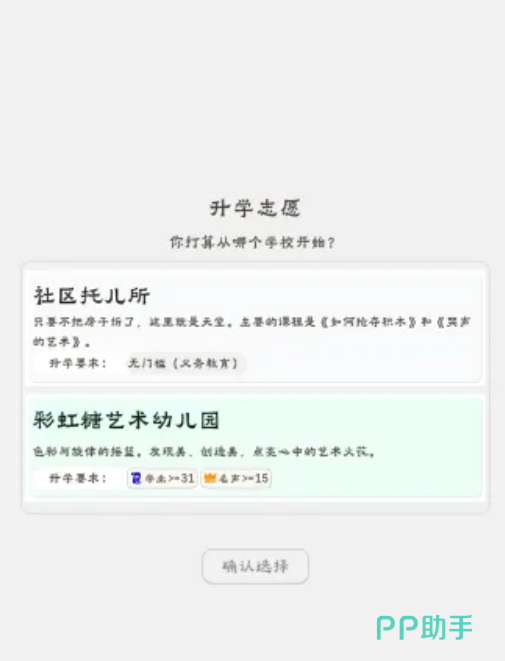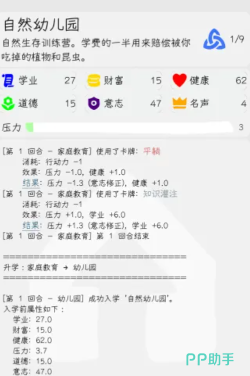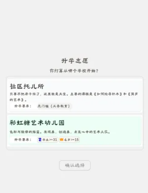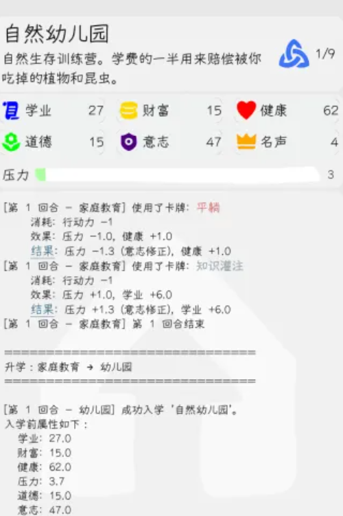 《升学模拟器》是一款以教育成长为主线的策略向文字模拟游戏,采用卡牌驱动机制,玩家将化身不同背景的学生角色,从幼儿园起步,历经小学、初中、高中、本科、研究生等完整教育阶段。游戏核心围绕升学路径规划展开,强调资源分配、能力培养与关键抉择——学业值、财富值、声望值三大属性随时间推移动态变化,直接影响升学结果与人生走向。