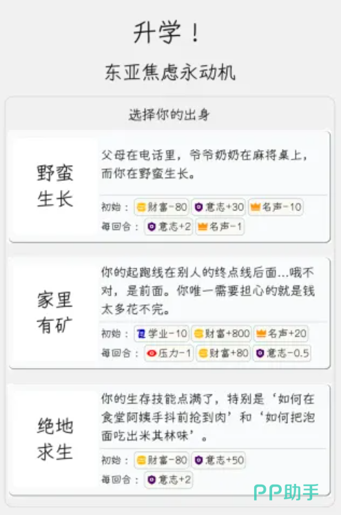 当前游戏处于预约阶段,尚未正式上线。其界面设计高度凝练,全程以极简文字叙事配合关键数值反馈,弱化视觉干扰,强化策略思考深度。开局可自由选择初始出身设定:野蛮生长(资源匮乏但自由度高)、家里有矿(经济宽裕但目标受限)、绝地求生(高难度起始,高回报潜力),不同起点将显著影响后续事件触发概率与成长曲线。