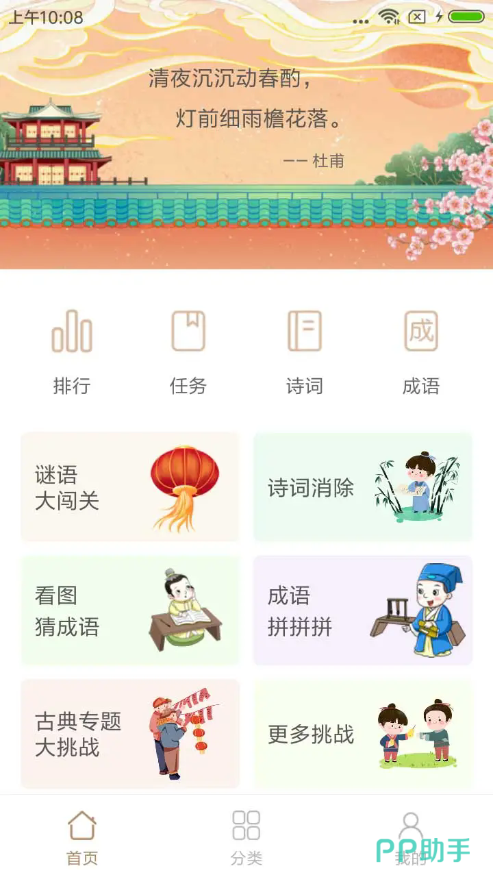 集成式谜题引擎,统一管理成语、俗语、地名、人名、诗词填空等多类型题库,总题量逾十万道。分类导航栏层级清晰,点击任一标签即可加载对应领域全部题目。内建三级提示系统:首级显示谜底字数,次级揭示核心偏旁或声母,末级直接展示答案并附解析,保障零失败体验。