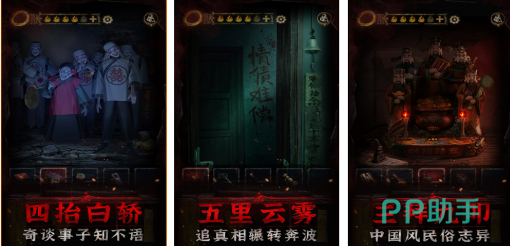 延续系列标志性红黑配色与民俗意象,本作深化中式婚俗禁忌设定。解谜机制融合剪纸、刺绣、八字命理等传统文化要素,道具交互逻辑紧密关联背景叙事。章节式推进结构保障剧情密度,伏笔回收严谨,支撑起扎实的世界观厚度。