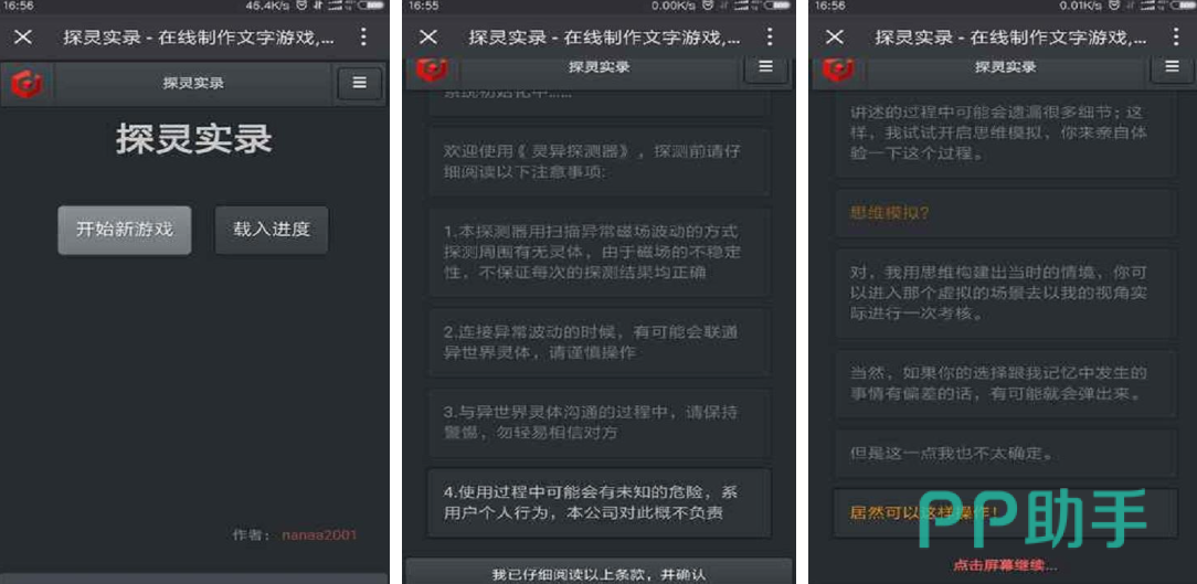 以纯文字交互为载体的规则怪谈类作品,采用极简黑底白字界面模拟古籍手抄本阅读体验。百万字原创文本构建严密逻辑链,玩家需在有限提示中识别生存规则边界。每次选择触发不同因果路径,形成高自由度的恐怖叙事网络。