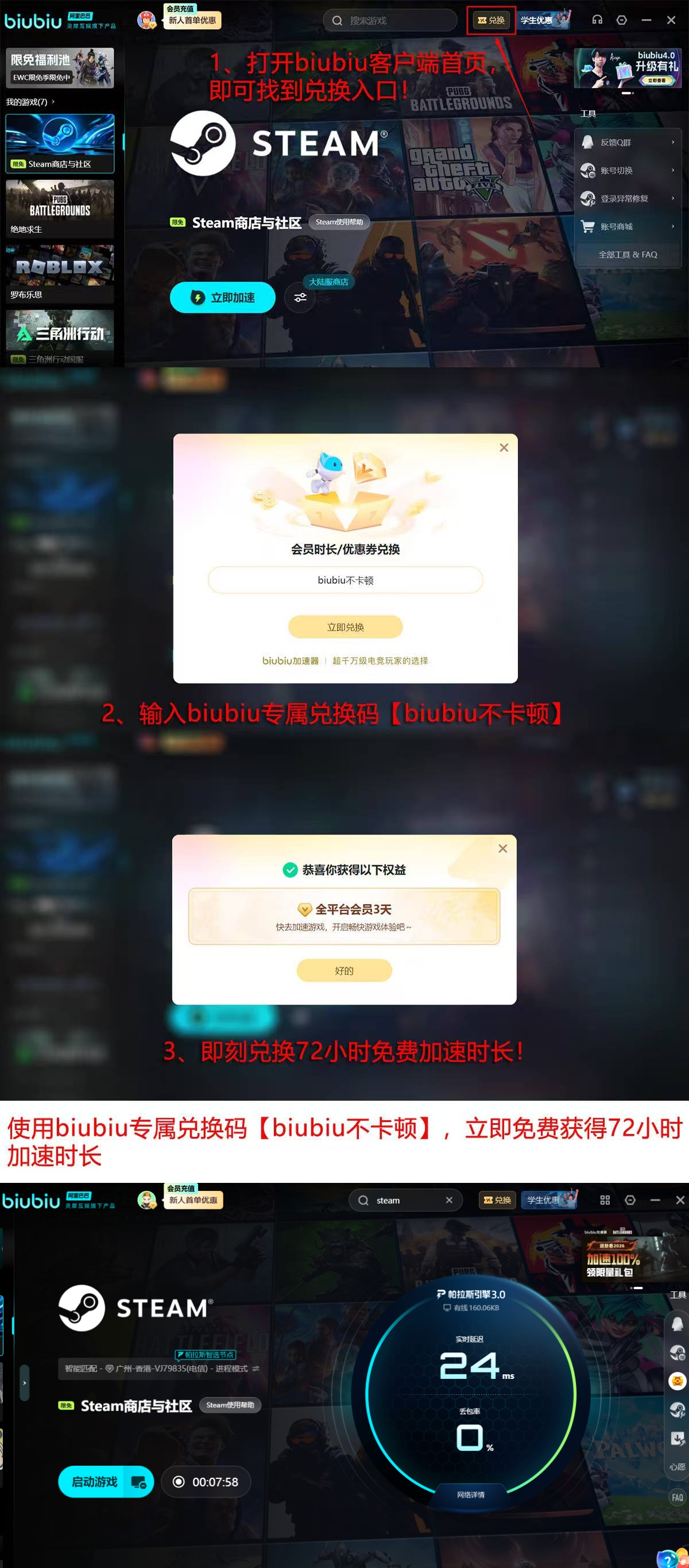 在高稳定性与低延迟双重验证下,biubiu加速器已获得职业电竞选手XDD(PUBG项目明星冠军选手)的官方选用与联合推广。作为对网络实时性、抗抖动能力及连接容错率要求极为严苛的职业用户,其长期使用反馈印证了该工具在高强度对抗场景下的可靠性。除核心加速性能外,biubiu加速器还提供面向新用户的实质性权益:注册即赠24小时免费体验时长;另附【biubiu不卡顿】专属兑换码,可额外激活72小时连续使用权,合计达96小时无门槛试用周期。