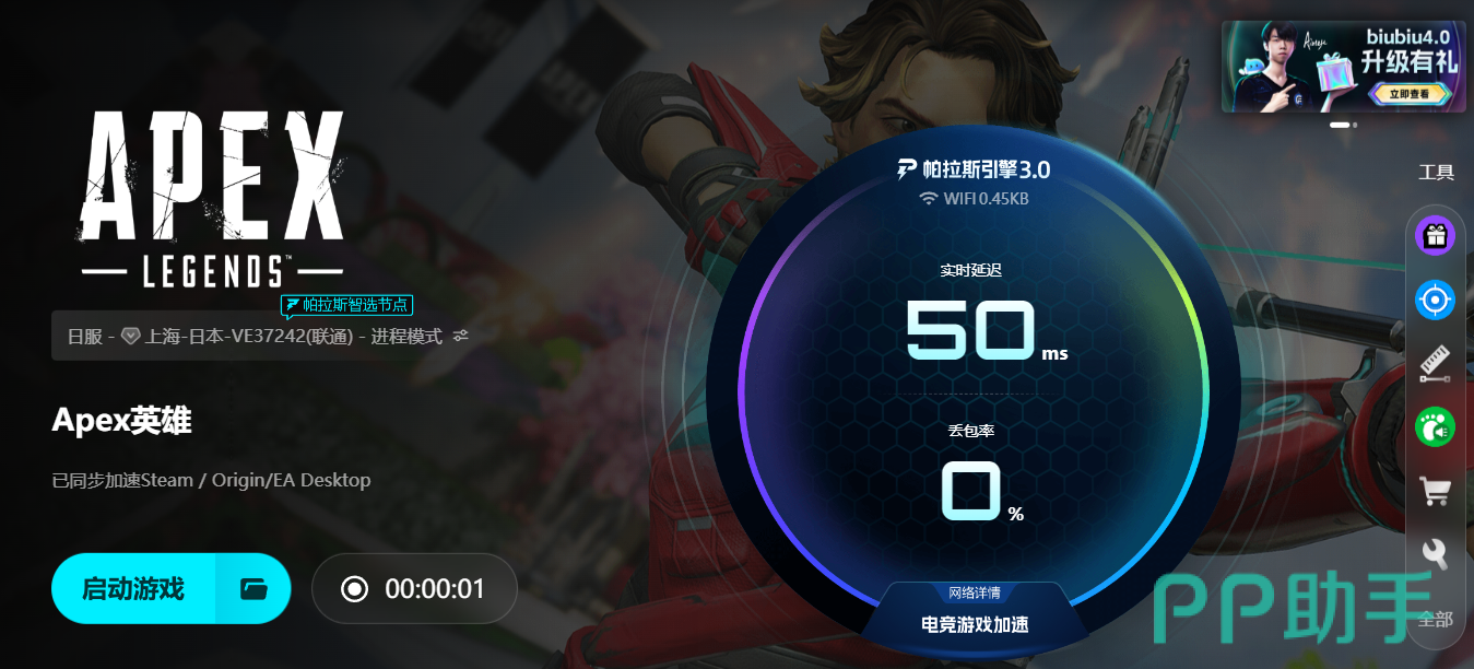 面向新用户,biubiu提供零门槛体验路径:完成注册即可获得24小时全功能免费加速权限;输入专属口令【biubiu不卡顿】,还可叠加领取72小时额外时长。全程无需手动配置IP或端口,启动加速器后选择《Apex英雄》图标,点击“一键加速”即可生效,适配Windows 10/11主流系统环境。