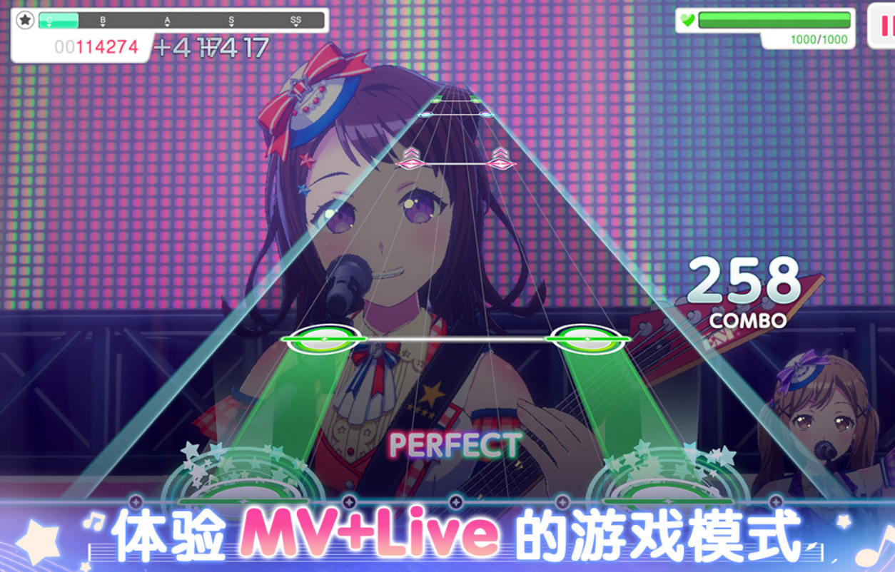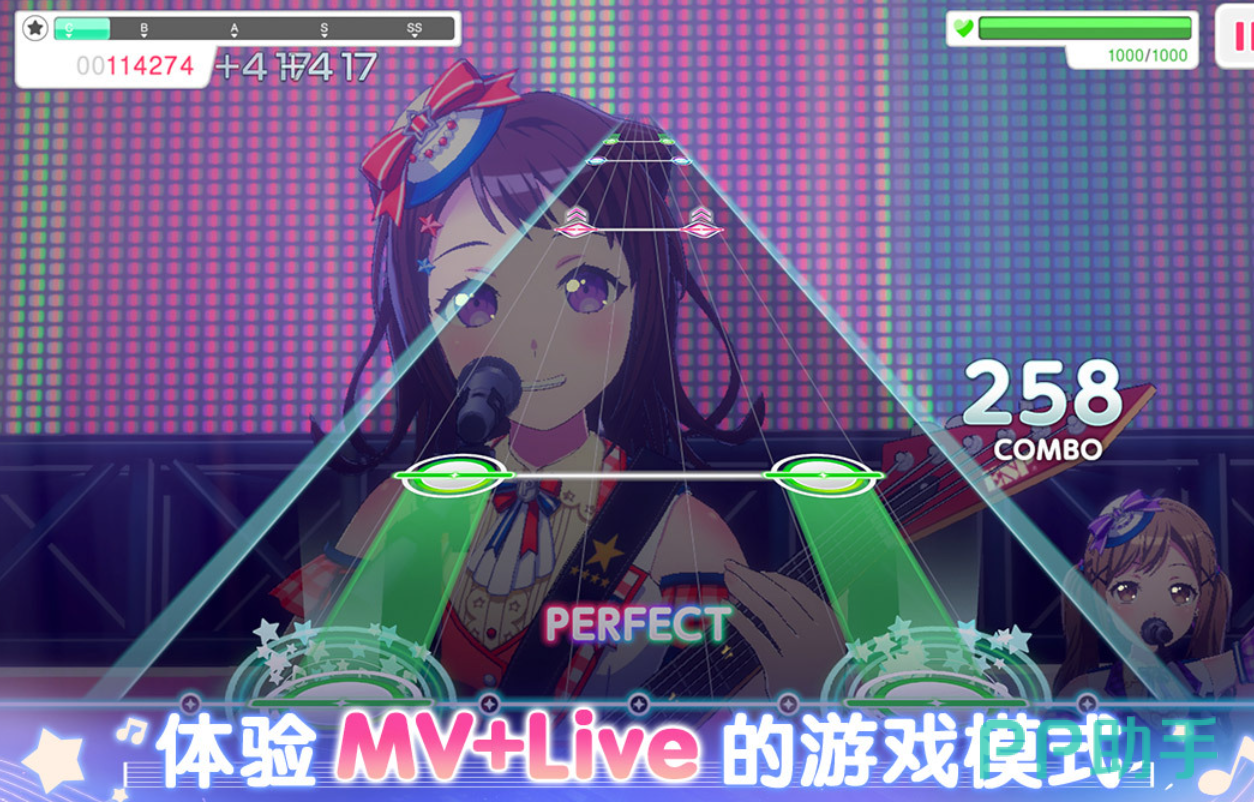 该作以乐队养成+节奏闯关双主线展开,首创“MV模式”与“Live模式”并行机制:前者侧重剧情沉浸,后者专注高难度操作挑战。角色立绘采用Live2D技术,演奏动作随节拍实时变化,配合环绕声场技术,实现声画同步还原。