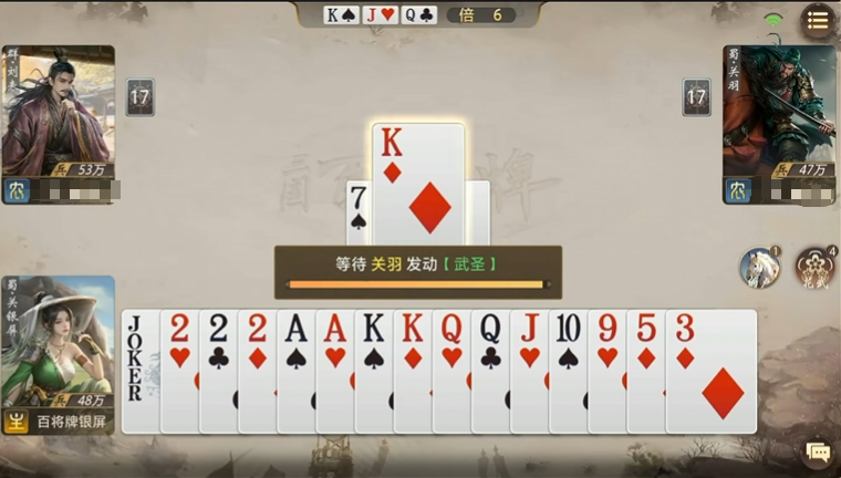 当手握J、Q、K且场上存在多组≥4张的牌型结构时,关银屏具备优先叫地主的策略价值。成为地主后,不仅掌握出牌主动权,更可通过前期高频出长牌型反复激活“花武”,加速高点数牌累积节奏,快速构建压制性手牌结构。