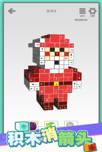 本作以箭头方向为核心机制,将积木设计为带指向性的动态元素,组合成小猪、汽车等趣味造型。玩家需观察箭头朝向,仅当目标方向无障碍物时方可点击消除。每关需清空全部箭头积木方为通关,对观察力、预判力与短时记忆提出明确要求。关卡结构采用阶梯式难度设计,从基础路径识别逐步进阶至多向干扰判断,持续激发玩家认知潜能。