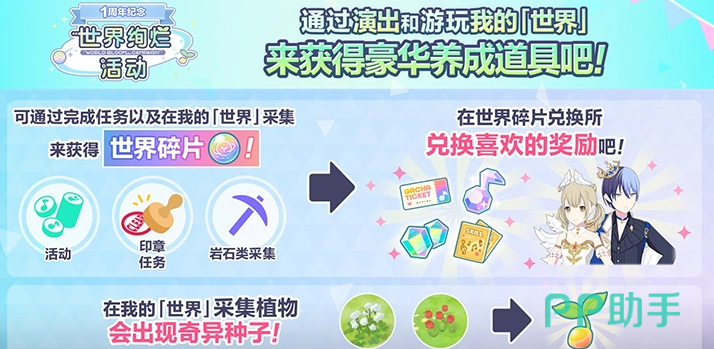 活动期间,每日登录还可额外获得能量饮料,用于恢复体力。该道具可自主储备或即时使用。同步开放的“印章任务”系统,可通过参与活动页互动、我的世界采集、角色招募等行为获取印章,集齐后兑换世界碎片。所有碎片均可在“世界碎片兑换所”中兑换限定奖励,包括一周年纪念服装、稀有道具等。