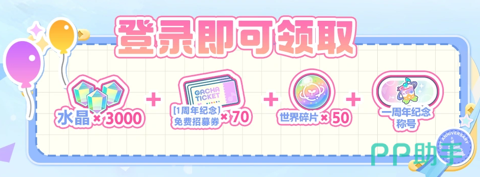 首项福利为登录即领活动:玩家在活动期间每日登录,即可直接于主界面领取3000水晶、70张限定招募券(仅限本次周年活动使用,结束后自动失效)、50个世界碎片及“周年纪念”专属称号。