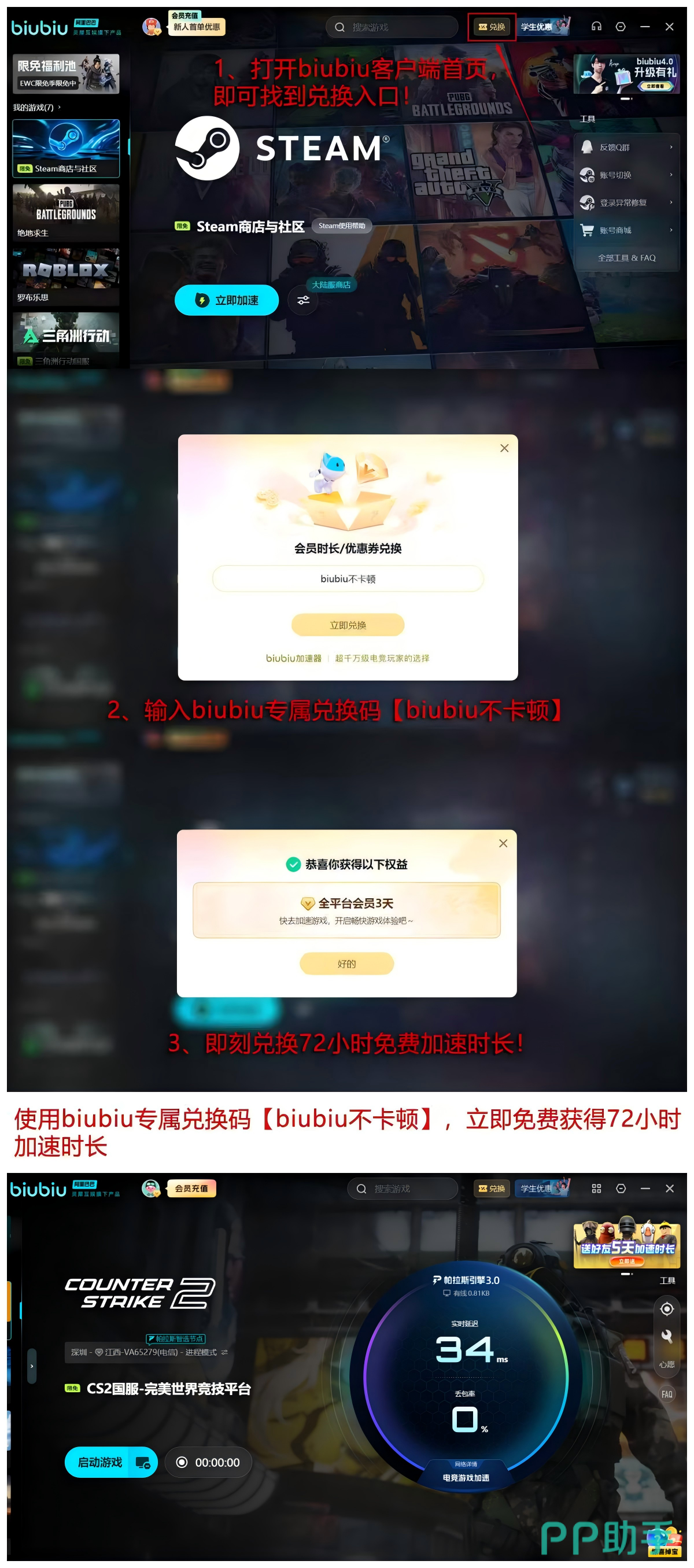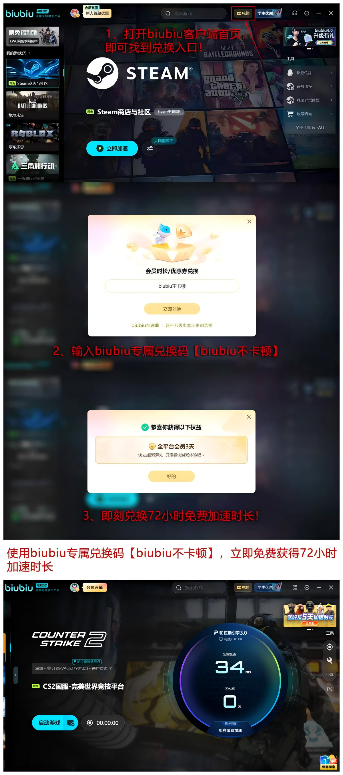 输入口令【biubiu不卡顿】即可领取72小时全节点加速权限;新用户另享叠加福利,累计可获得总计96小时的免费加速时长,覆盖多时段高强度训练及正式比赛需求,切实改善连接稳定性。