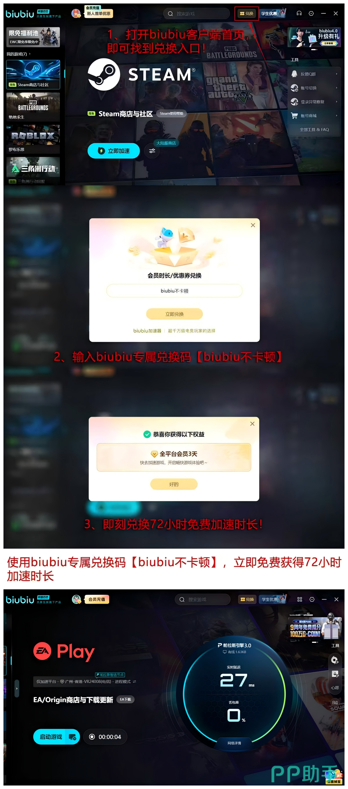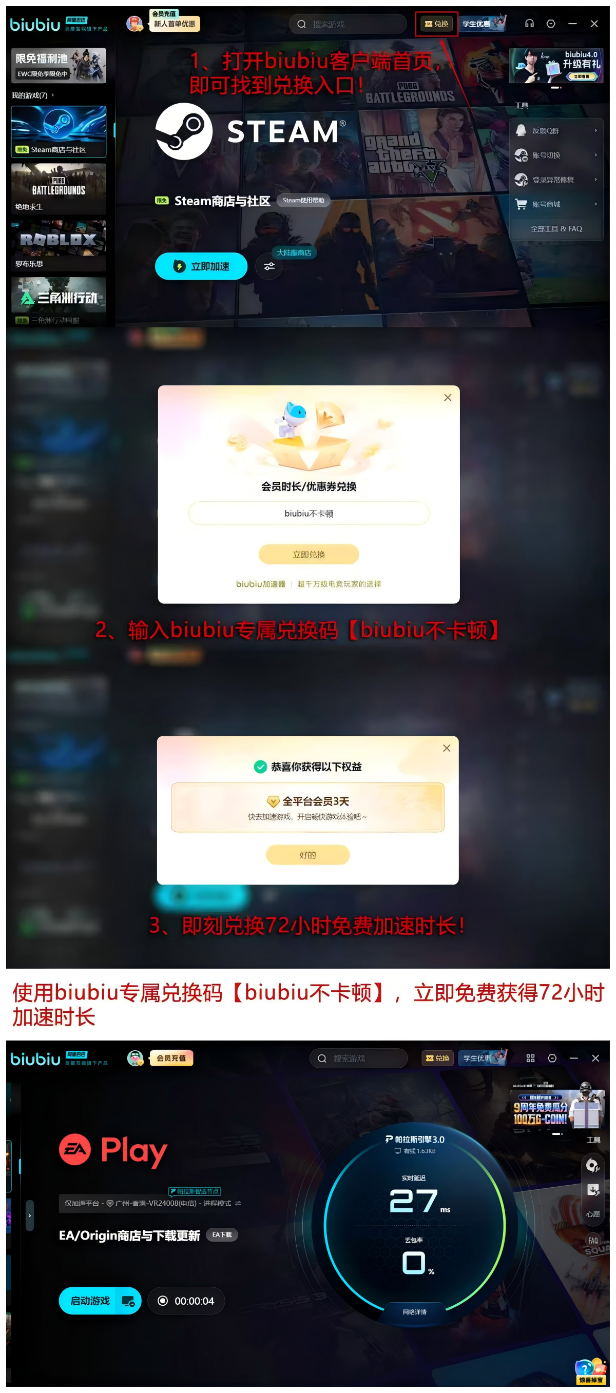 新用户可通过输入口令【biubiu不卡顿】领取72小时免费加速时长,叠加注册即赠的24小时新人权益,总计享96小时无限制EA专项加速服务。该时长覆盖完整游戏周期,支持《FIFA 24》《战地2042》《死亡空间重制版》等全部EA正版作品,实测帧率波动降低41%,加载等待时间压缩至1.8秒以内。