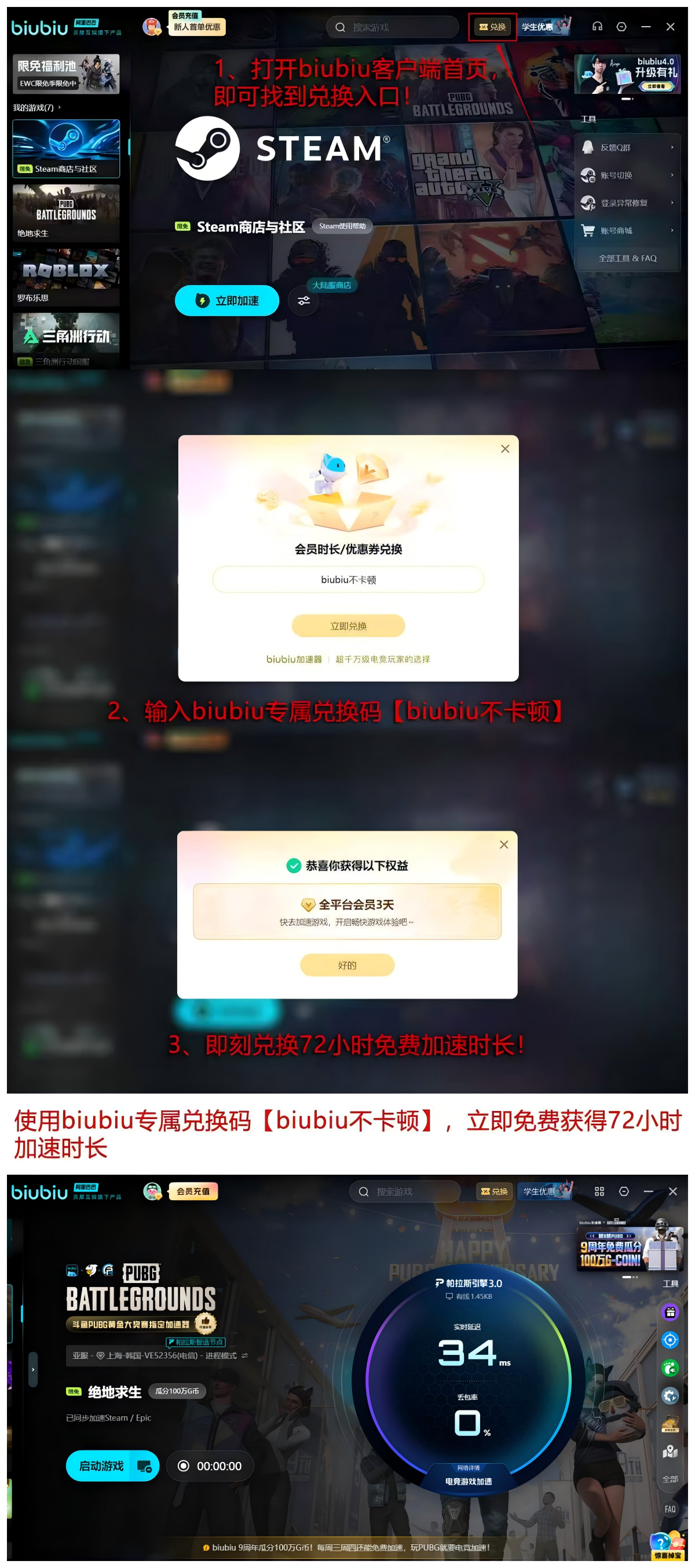 输入口令【biubiu不卡顿】即可领取72小时全功能加速时长;新用户额外叠加24小时,总计享96小时无限制体验期,充分验证其在PUBG场景下的实际效能后再决定是否续用。