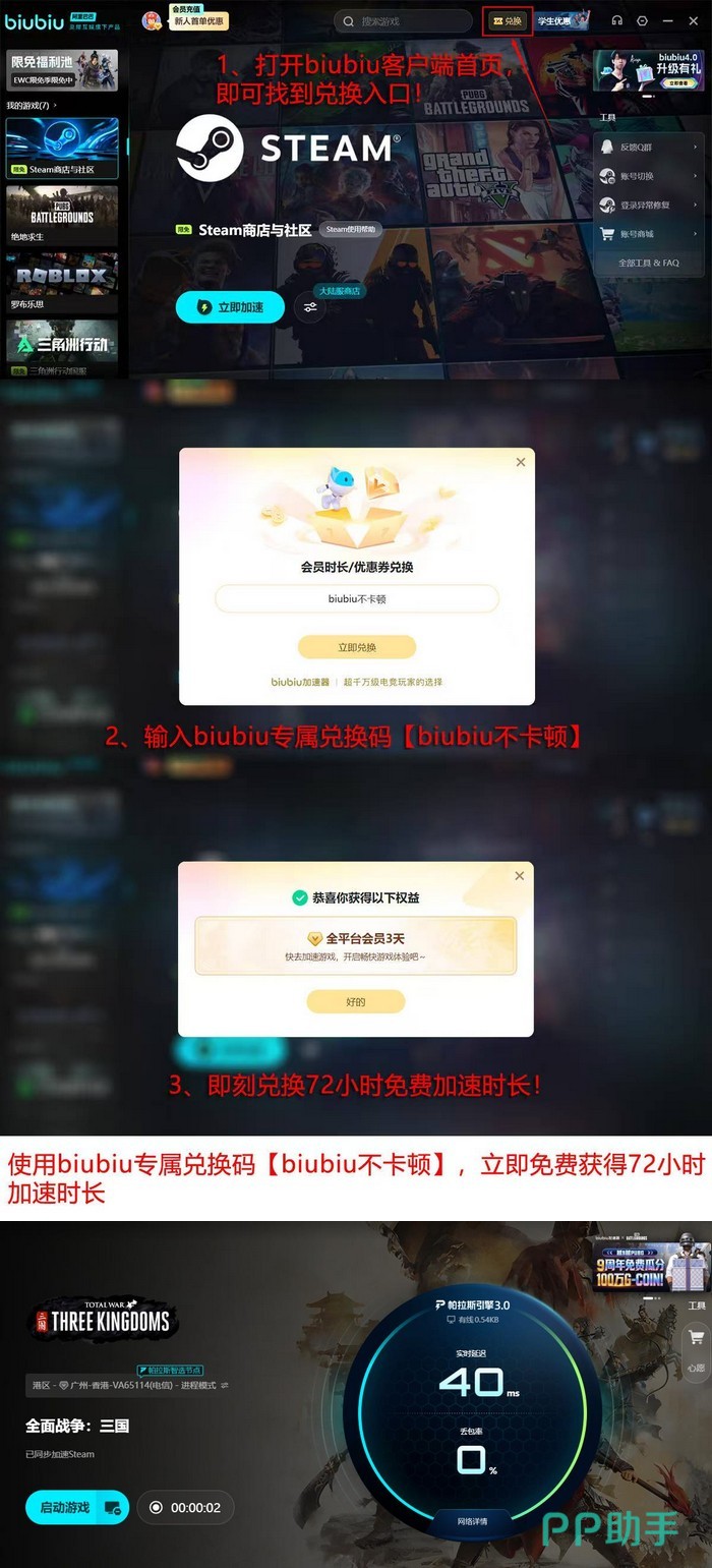 在用户权益层面,biubiu加速器提供切实可用的新手激励政策:完成注册即可自动获得24小时全游戏通用加速时长;叠加口令码“biubiu不卡顿”(须全部小写输入),还可额外兑换3天全平台VIP权限。两项权益可合并使用,新用户首次激活后总计享有96小时无限制加速体验,充分满足试用评估与长期游玩需求。