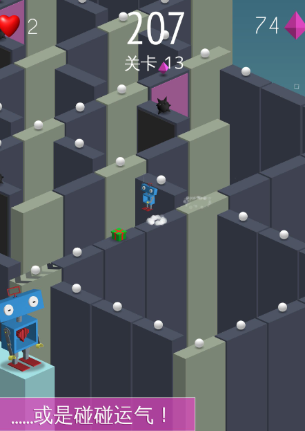场景构建基于三维欧几里得空间,道路宽度恒定且呈直线延伸,强调垂直方向的空间判断。玩家需在狭窄路径上完成物品收集与障碍规避双重目标。可选角色含机器人(重心稳定,跳跃弧线低)与小羊(弹跳高度大,滞空时间长),操作特性差异显著。所有障碍落点均符合抛物线运动规律,失误即坠落,考验玩家对几何运动轨迹的即时计算能力。
