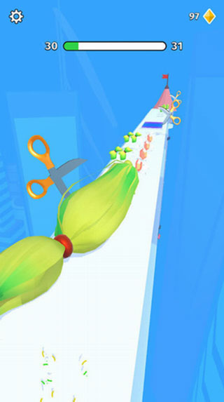 玩法设定兼具荒诞感与操作精度要求:操控初始发长仅数厘米的角色,在横向卷轴赛道中持续前进。途中需规避高频出现的剪切类障碍(如弹出剪刀、旋转电锯、下坠裁纸刀),同时维持发丝长度不减反增。发量增长直接关联角色移动稳定性与跳跃高度,达成终点前可自由选择RGB全色系染发方案,实现造型与功能的统一。