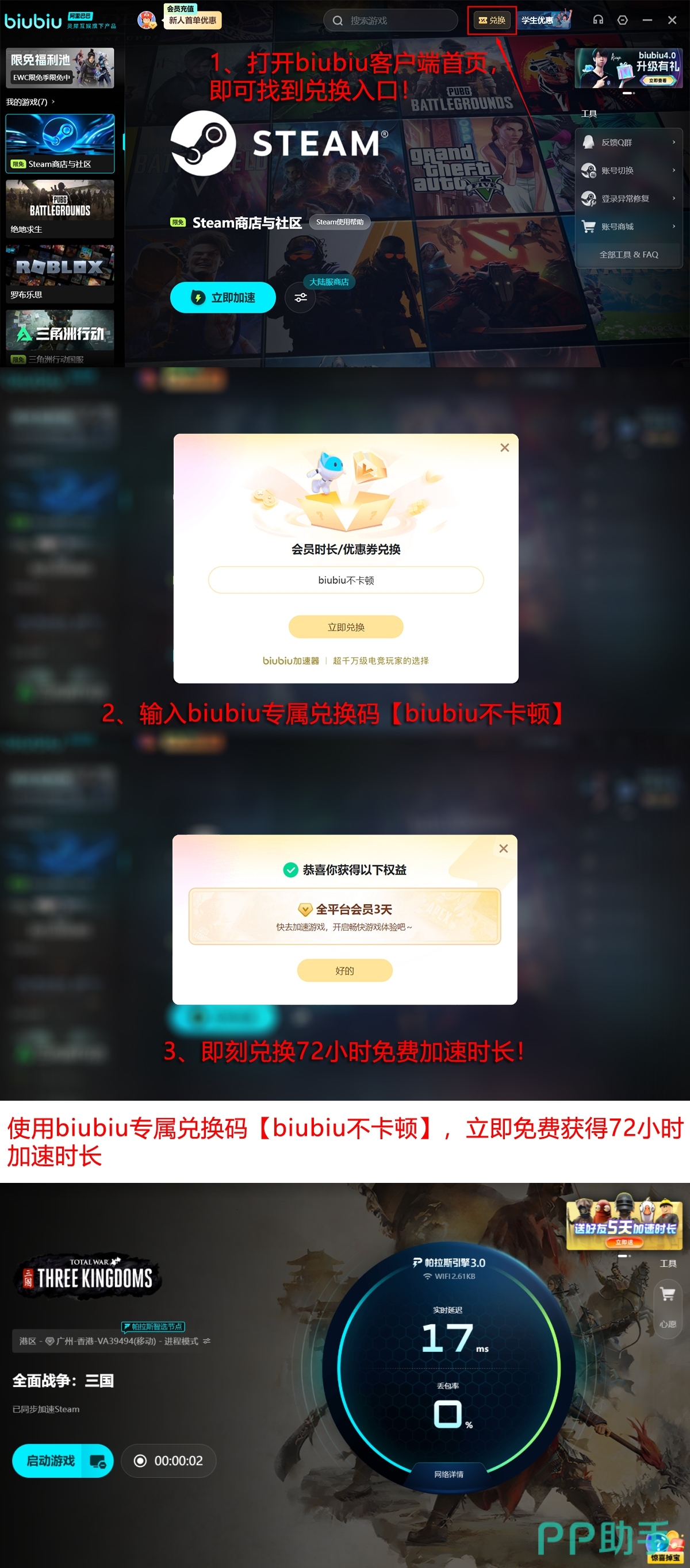 新用户注册即赠24小时免费加速时长;输入激活码【biubiu不卡顿】,无论新老账户均可额外领取3天全功能体验权限,足够完成数局完整战役,直观感受低延迟操作带来的战术优势。