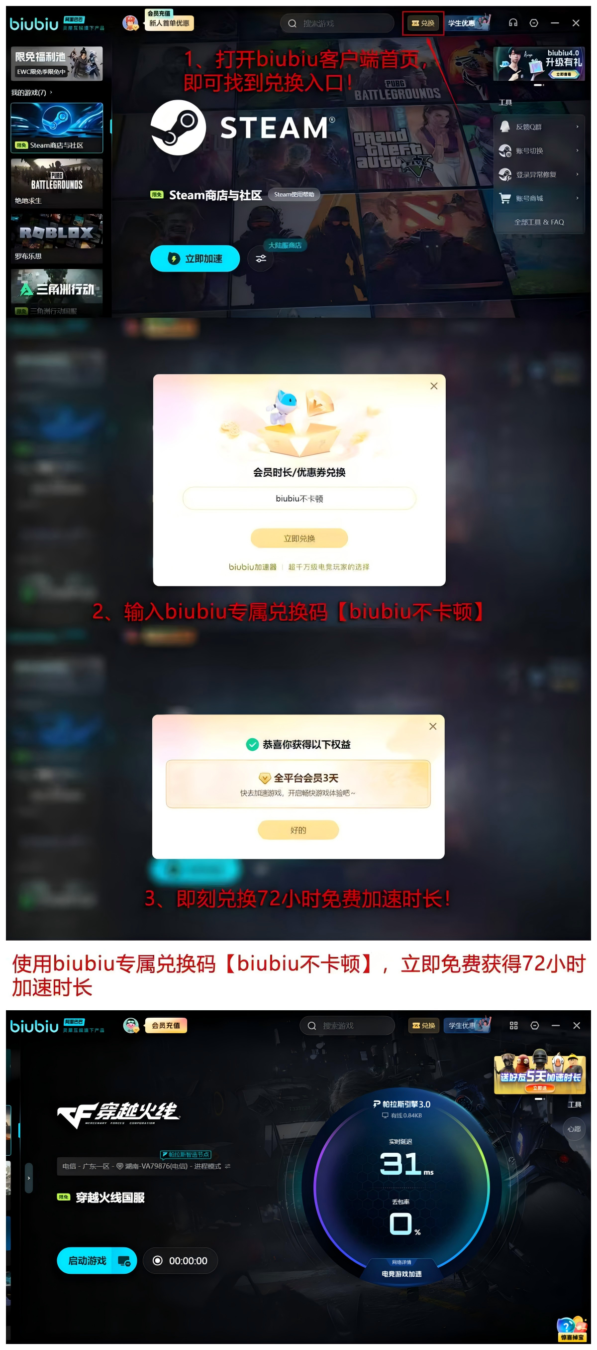 新用户输入口令【biubiu不卡顿】即可即时兑换72小时加速权限;叠加完成新手引导任务后,还可额外获得24小时专属福利,总计96小时免计费使用时长。该组合权益覆盖完整新手周期,适合尚未深度体验该工具的CF玩家高效入门。