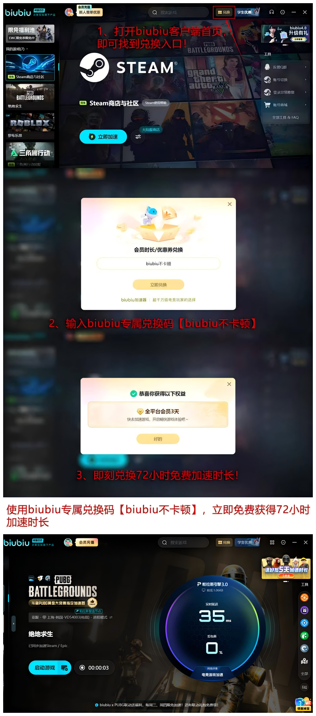 新用户注册后输入口令【biubiu不卡顿】,即可即时到账72小时高级加速时长;叠加首日签到赠送的24小时福利,总计可享96小时无限制使用权限。所有时长支持手动激活,便于根据排位赛、组队活动等关键场景灵活调度,避免资源闲置。