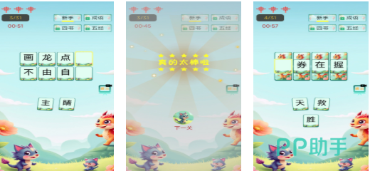 专为3–8岁儿童研发的语言启蒙类游戏。每关提供数个汉字模块,需拖拽组合成正确答案,同步强化字形识别、笔顺理解与基础组词能力。卡通画风柔和亲切,语音提示清晰友好,无广告干扰,符合儿童数字产品安全规范。