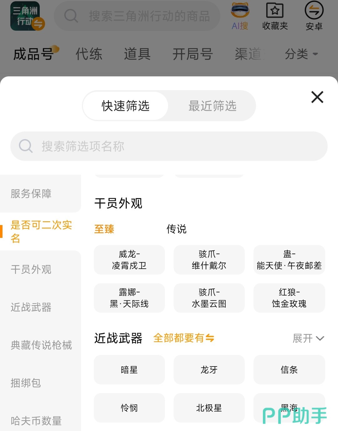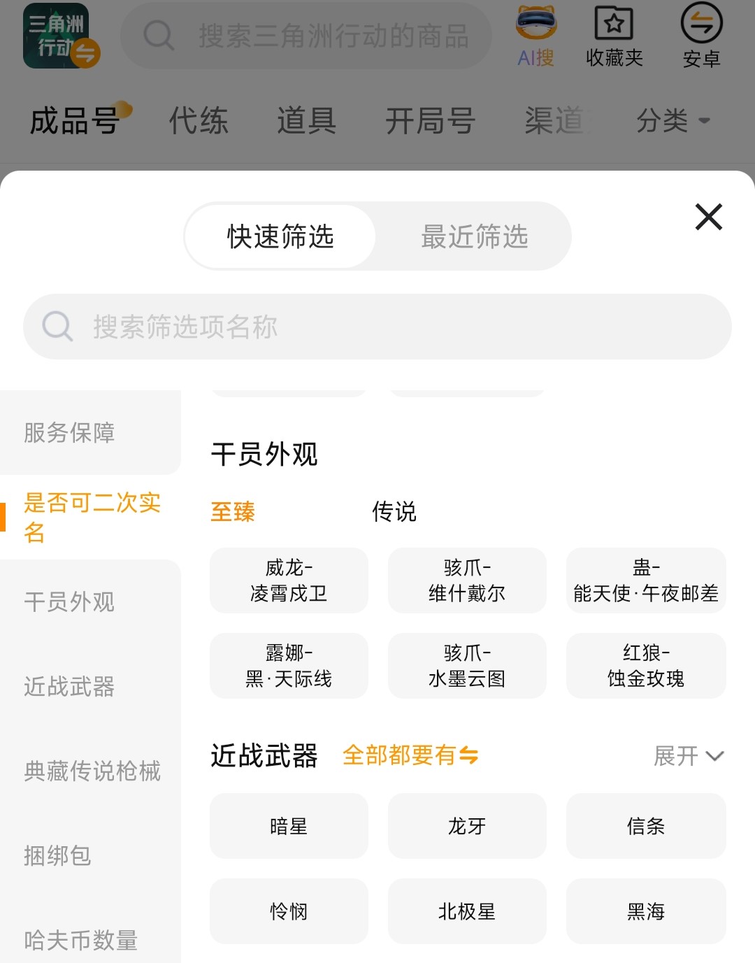 随着《三角洲行动》公测周期延长,大量玩家已完成高等级养成,账号市场供给日益丰富。在交易猫平台上,已上架账号普遍涵盖满配武器库、稀有皮肤、高阶战术装备及完整主线进度。为提升匹配精度,用户可综合运用多维筛选条件:包括角色等级(常见为45级及以上)、主武器类型(如突击步枪/狙击步枪)、关键道具持有量(如战术无人机、高级医疗包)、是否含限定外观等,精细化设置后显著缩短目标账号定位耗时。