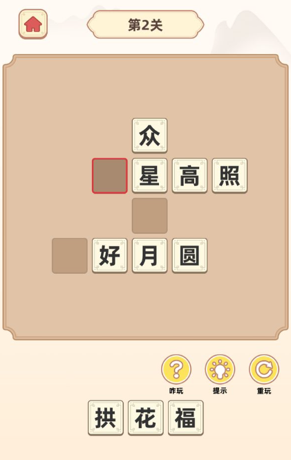 本作设置超1400关原创题型,每关配有清晰提示,包括字义解析、方位线索(如横向释义、纵向结构)等,引导玩家理解构词逻辑。操作采用拖选式交互,从底部候选字库中择取正确汉字填入网格,答案匹配即自动锁定显示,流程直观高效。
