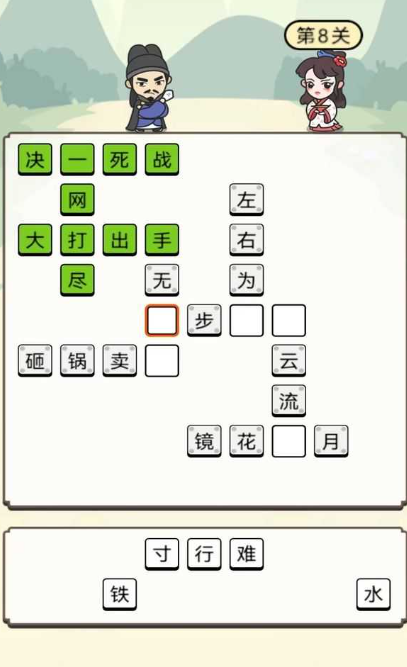 突破常规接龙形式,采用动态字块布局:屏幕分布多个含单字的可交互方块,玩家需依据提示筛选目标字,填入下方四格序列,组合成规范四字成语。中后期关卡引入大量形近字组合,考验辨析能力;内置道具系统支持关键节点辅助通关。