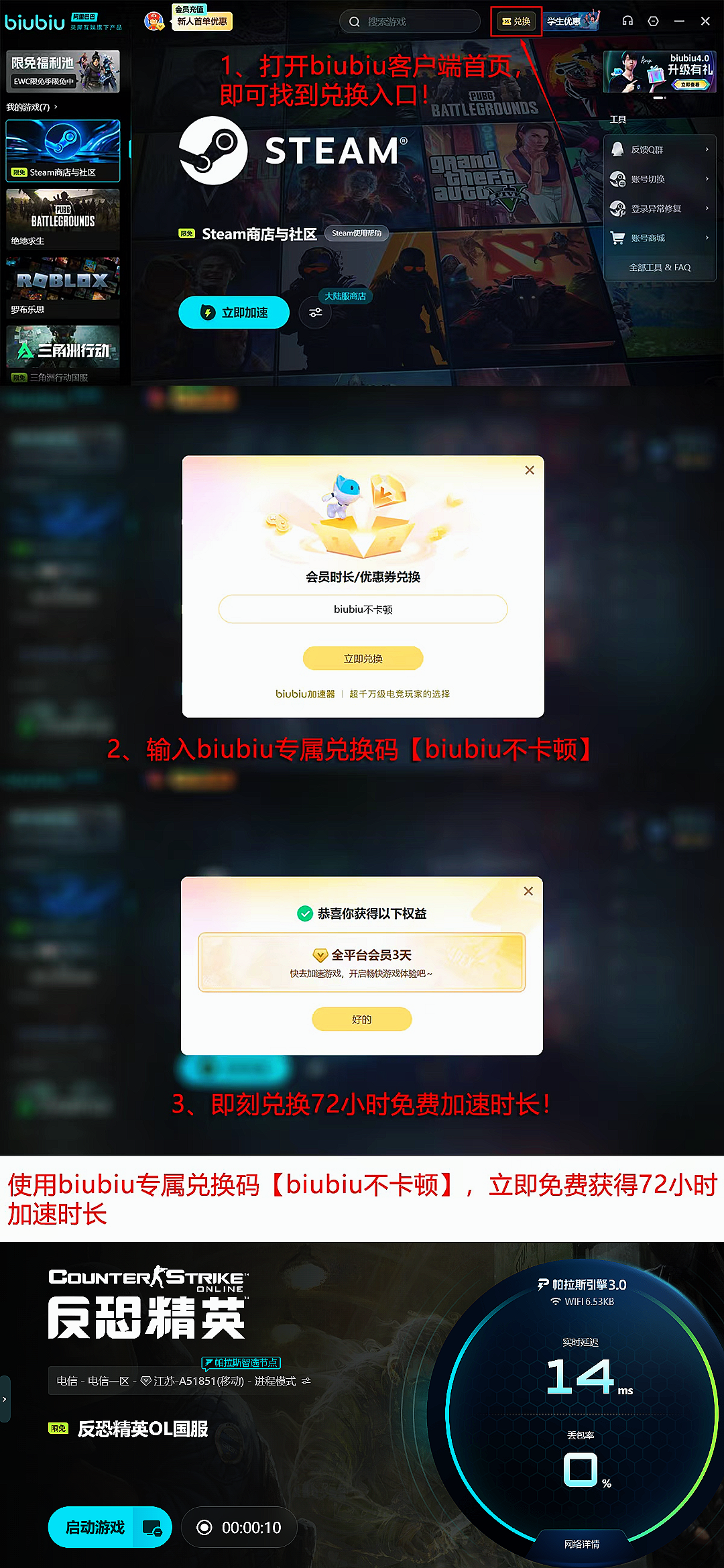 新注册用户可直接获得24小时全游戏不限速加速权益,零门槛即刻启用。所有用户输入专属兑换码【biubiu不卡顿】,即可领取3天通用加速时长;新用户在此基础上还可叠加96小时额外时长,总计120小时加速服务自动到账,无需手动续订。