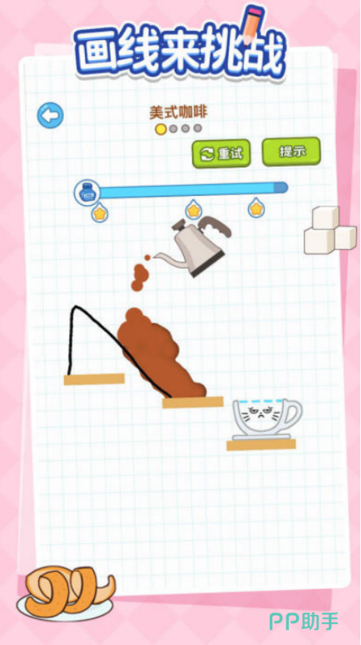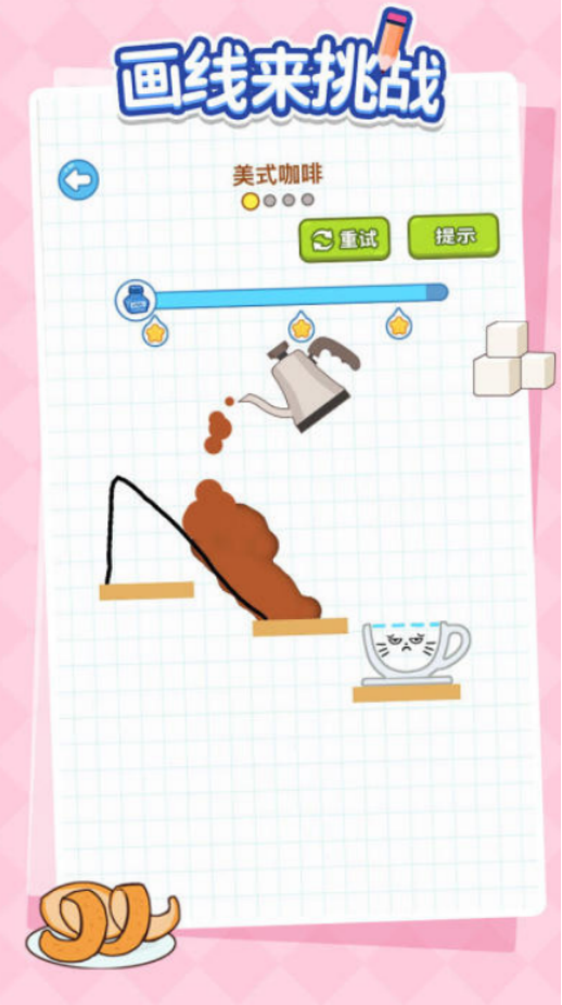 采用极简线条交互机制,提供“划线导流”“轨迹引导”“物理碰撞”等多种子模式。例如在“美式咖啡”关卡中,玩家需绘制精准路径,使液体沿设定轨迹流入目标容器;不同章节切换主题场景与物理规则,题目随机生成且无固定解法,考验手眼协调、预判能力与空间建模思维。