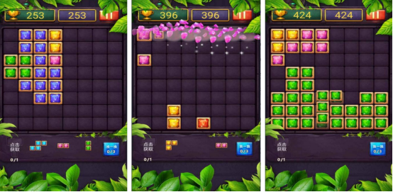 以高饱和度渐变色系重构视觉体系,延续单行消除底层规则,但强化色彩识别与空间预判要求。所有方块均采用通透材质渲染,滑动拖拽过程具备物理惯性反馈。虽入门门槛极低,但中后期需统筹相邻行间色块分布、预留关键空位,对短时记忆与路径规划能力形成持续挑战。