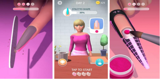 融合美甲制作与角色穿搭双重玩法,主打轻量化设计与强解压反馈。游戏流程涵盖基础修甲(修剪、打磨、抛光)、色彩涂抹、图案叠加、亮油封层等步骤,操作方式以点选+拖拽为主,响应迅速。素材库包含数百种色系与几何/花卉/闪钻等风格化图案,支持自由混搭,满足不同审美倾向的创作需求。