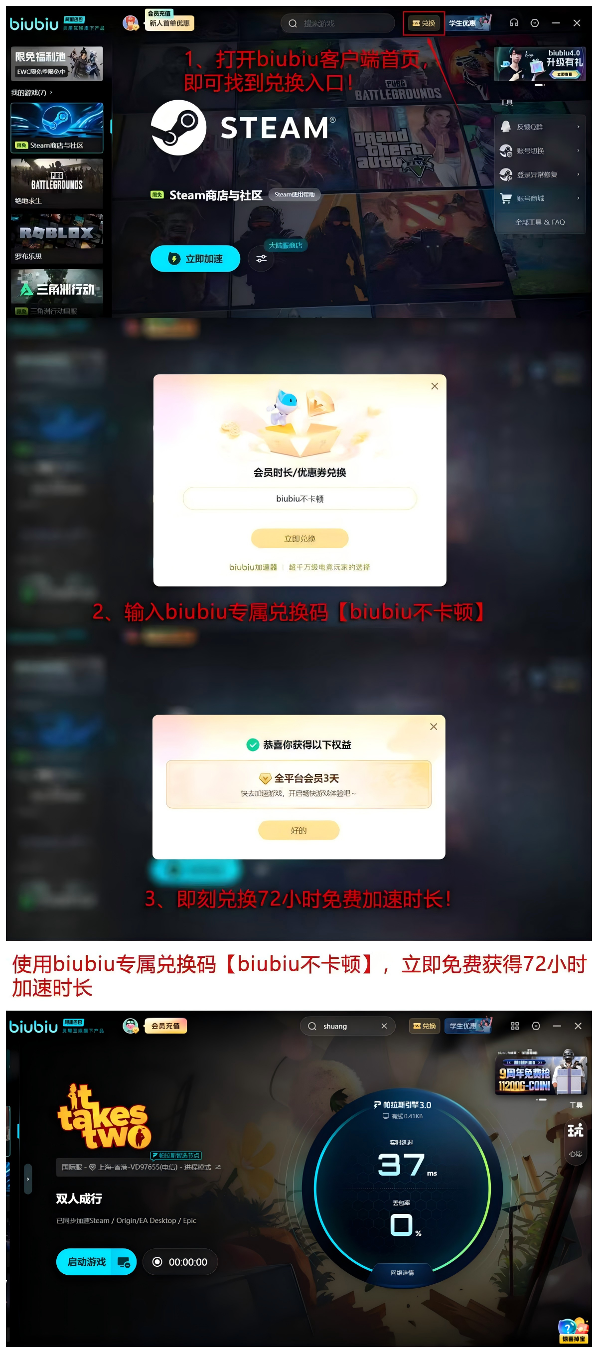 新用户注册后输入口令【biubiu不卡顿】,即可即时领取72个小时免费加速时长;叠加完成新手任务后额外获得的新人福利24小时,总计可享96小时全功能体验周期,充分覆盖安装、测试、深度游玩等各阶段需求。