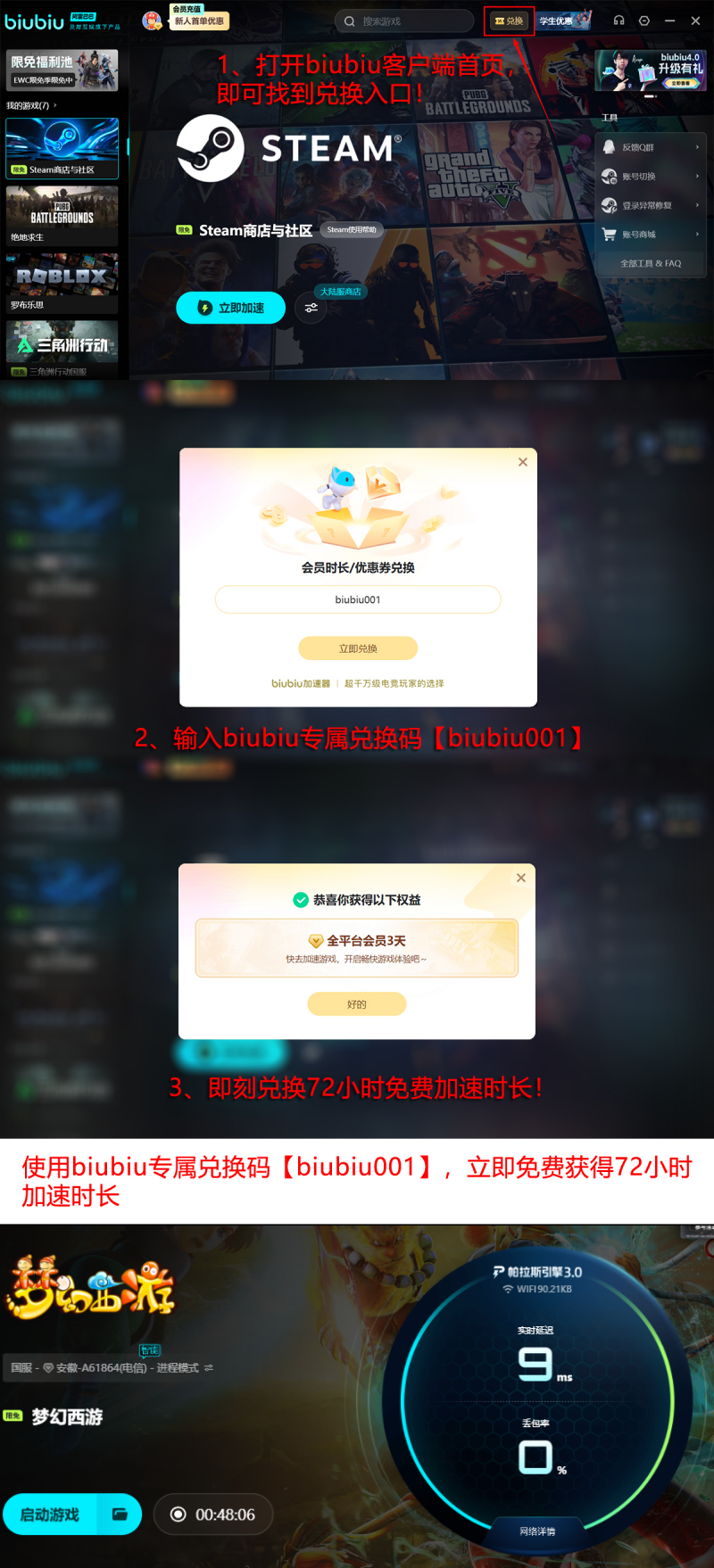 目前biubiu加速器面向全体《梦幻西游》玩家开放限时福利:所有用户均可凭通用兑换码【biubiu001】领取3天免费加速权限;新注册用户额外获赠24小时新手专属加速时长。两项权益叠加使用,总计可享96小时连续稳定加速服务,足以支撑多轮满星地煞、跨服擂台备战及整套剧情副本通关。