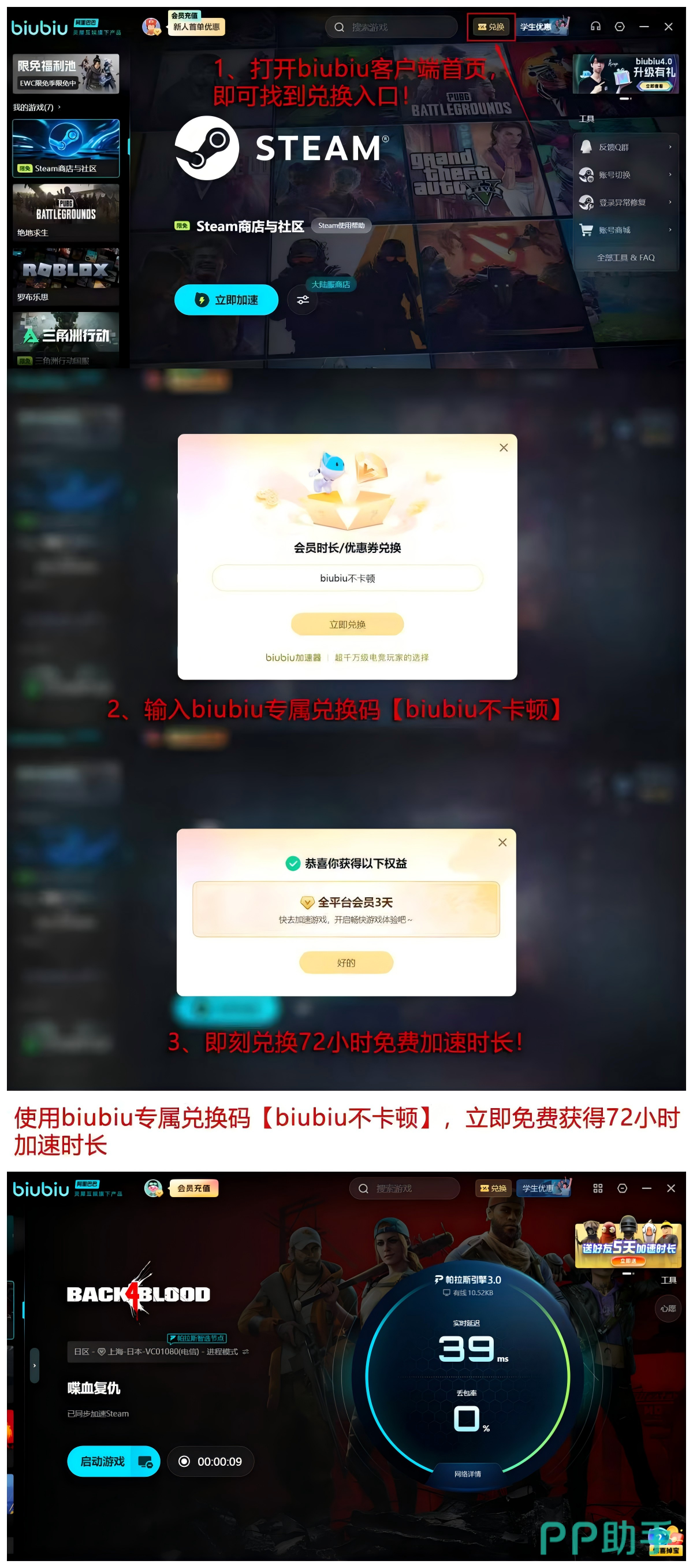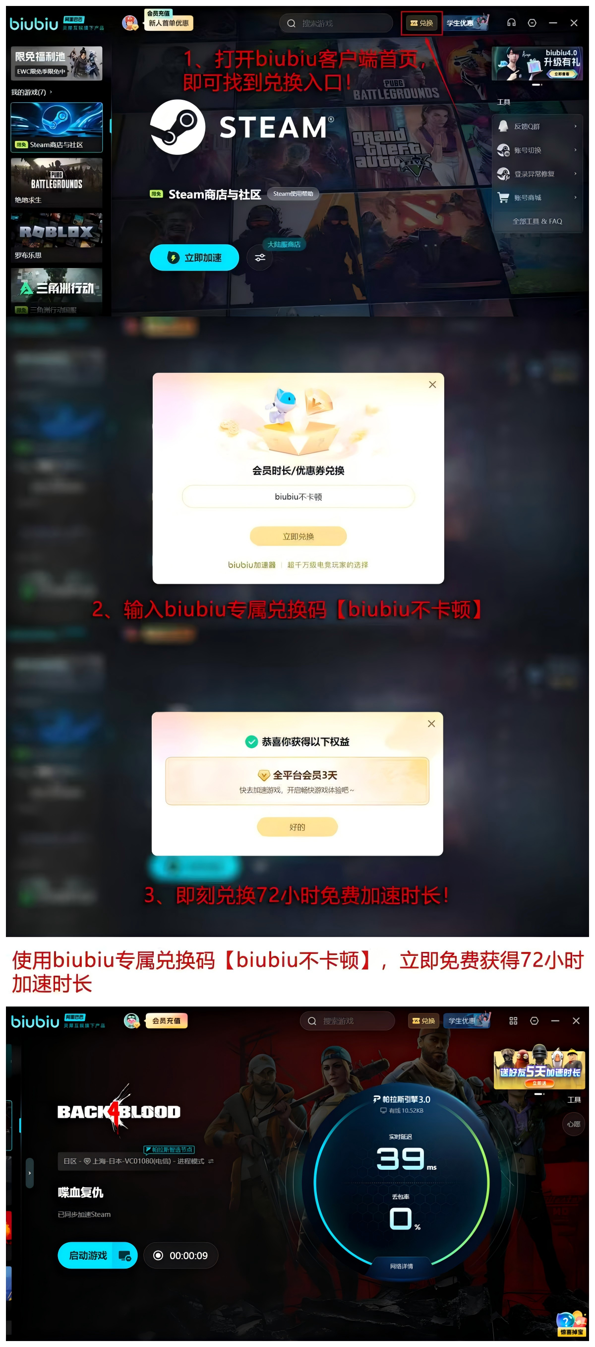 新用户输入口令【biubiu不卡顿】即可领取72小时高级加速服务,首登福利叠加24小时试用时长,总计享96小时全功能体验权限,充分验证加速前后在匹配成功率、战斗帧率稳定性及语音同步质量等方面的差异。