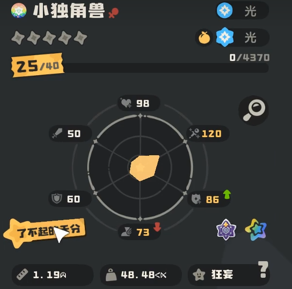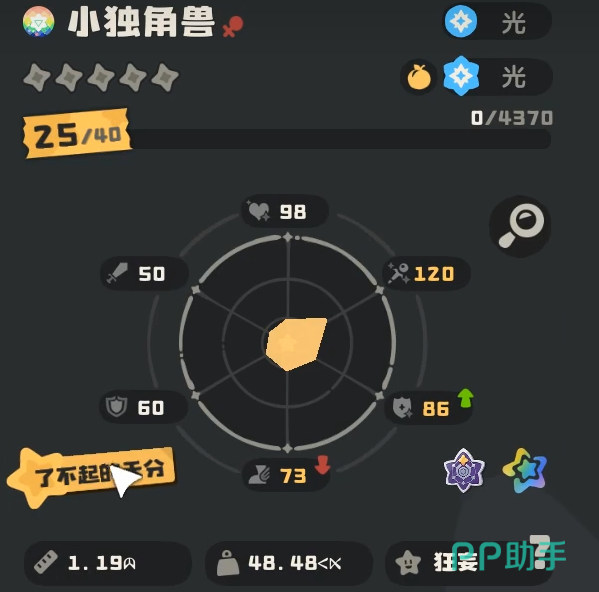 根据当前版本实测数据,小独角兽的基础种族值总和为483点。其中魔攻项成长表现突出,是其核心输出维度;而生命值成长偏低,导致生存容错率有限,在高强度PVE或PVP对抗中需谨慎部署站位与技能释放节奏。