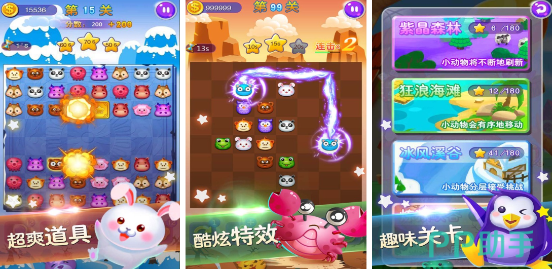 以高节奏消除为核心体验,界面UI采用软萌圆润设计语言,强化视觉亲和力。关卡数量充足,任务链设计注重互动反馈;道具系统覆盖范围广,包括闪电清除、区域重置、时间延长等实用功能;宠物形象涵盖猫、狗、兔、狐等多种拟人化设定,配合动态特效提升沉浸感。