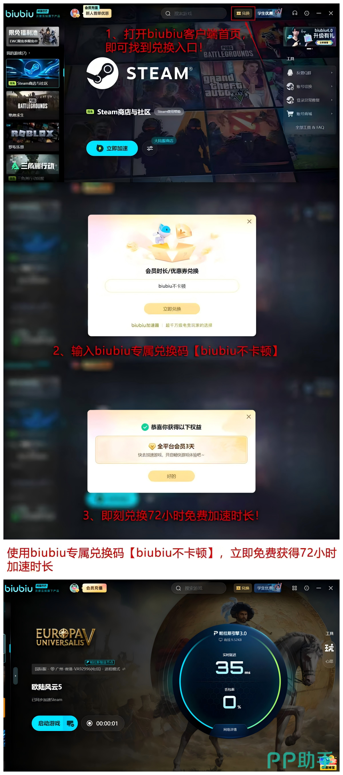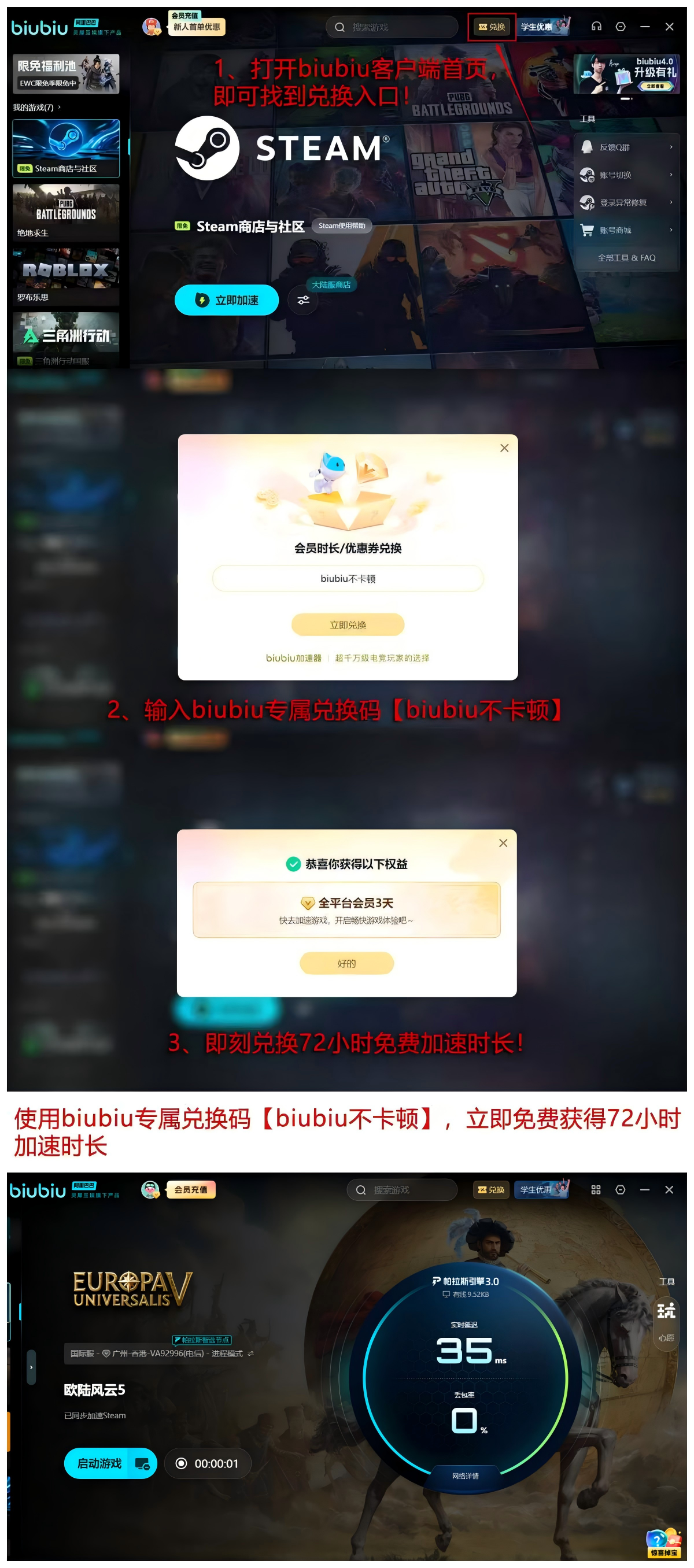当前平台持续开放限时福利:输入口令【biubiu不卡顿】即可领取72小时高级加速时长,该权益可与新用户注册即赠的24小时叠加使用,总计达96小时。该方案适合希望低成本验证加速效果、或短期集中推进长线存档的玩家群体。