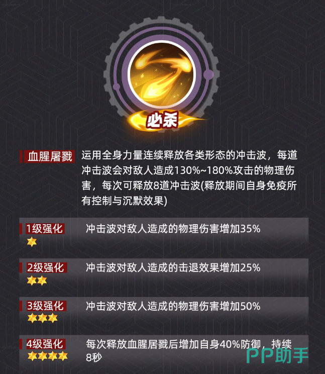 核心机制之一为必杀技【血腥屠戮】:该技能发动时将连续造成8段范围伤害,并在全程内获得控制免疫与沉默免疫效果。当技能升至四级强化后,还将额外提升自身防御值。因此,打断施法窗口是关键突破口——务必在其前摇阶段使用强控或高硬直技能予以干扰,避免进入不可控的持续输出阶段,否则将大幅压缩我方有效输出时间。