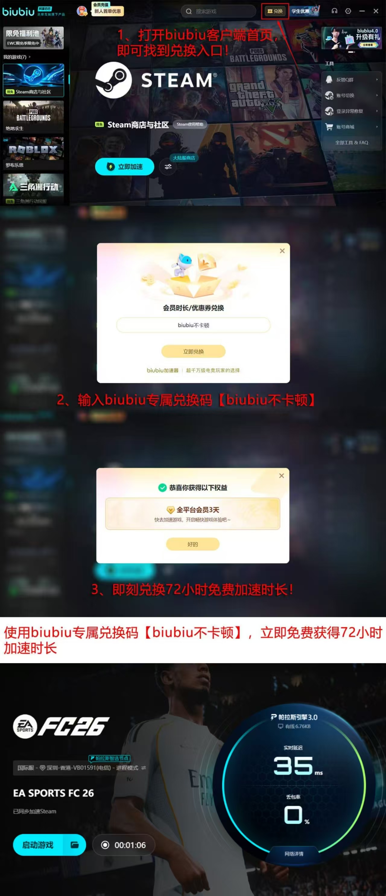 为降低体验门槛,biubiu加速器面向新用户开放24小时全功能免费试用;所有用户(含新老用户)输入兑换码【biubiu不卡顿】,即可额外获得72小时加速时长;新用户累计可享总计96小时无限制加速服务,充分覆盖适应期与高频使用阶段。