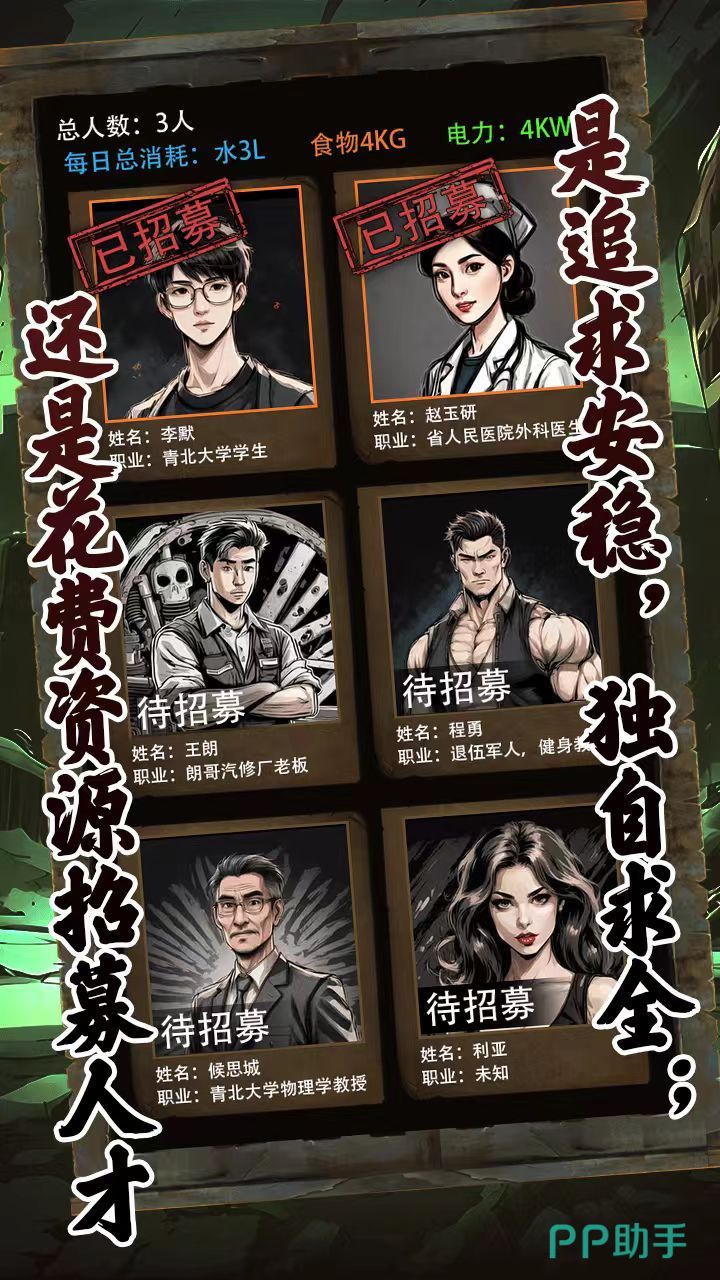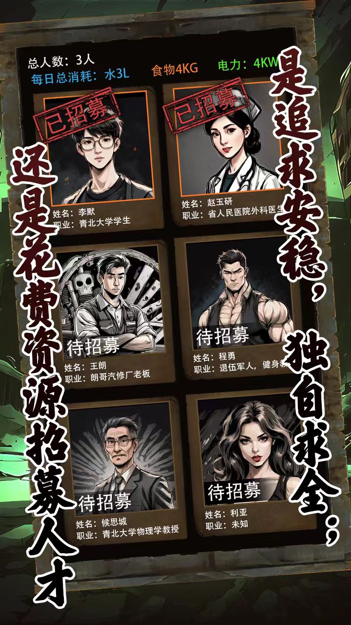 游戏中设有幸存者招募系统,涵盖战斗型、采集型、建造型、医疗型四类职业角色。通过属性培养与技能树解锁,可显著提升其工作效率与战场适配性。例如高敏捷采集者可缩短资源获取周期,资深医生能降低治疗失败率,战术指挥官则可优化防御阵型响应逻辑。