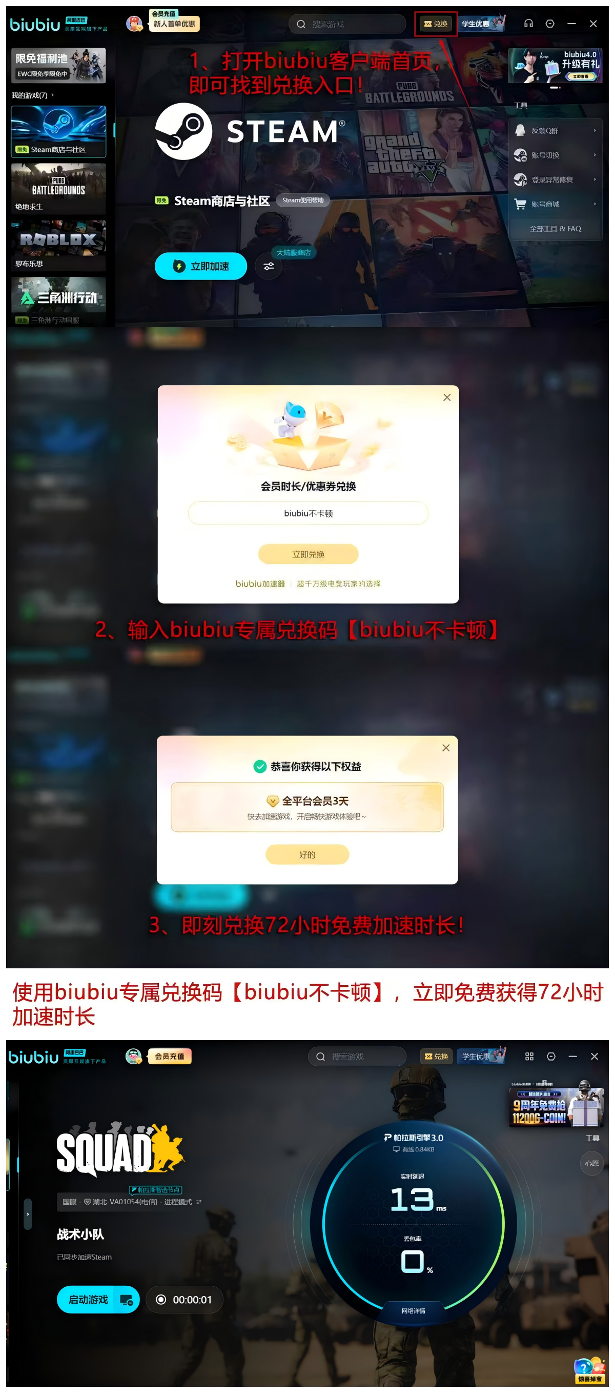 新用户可通过口令【biubiu不卡顿】领取72小时无限制加速权益,叠加首次注册奖励的24小时加成,总计享96小时全功能体验,适用于需要验证实际加速效能的潜在付费用户。