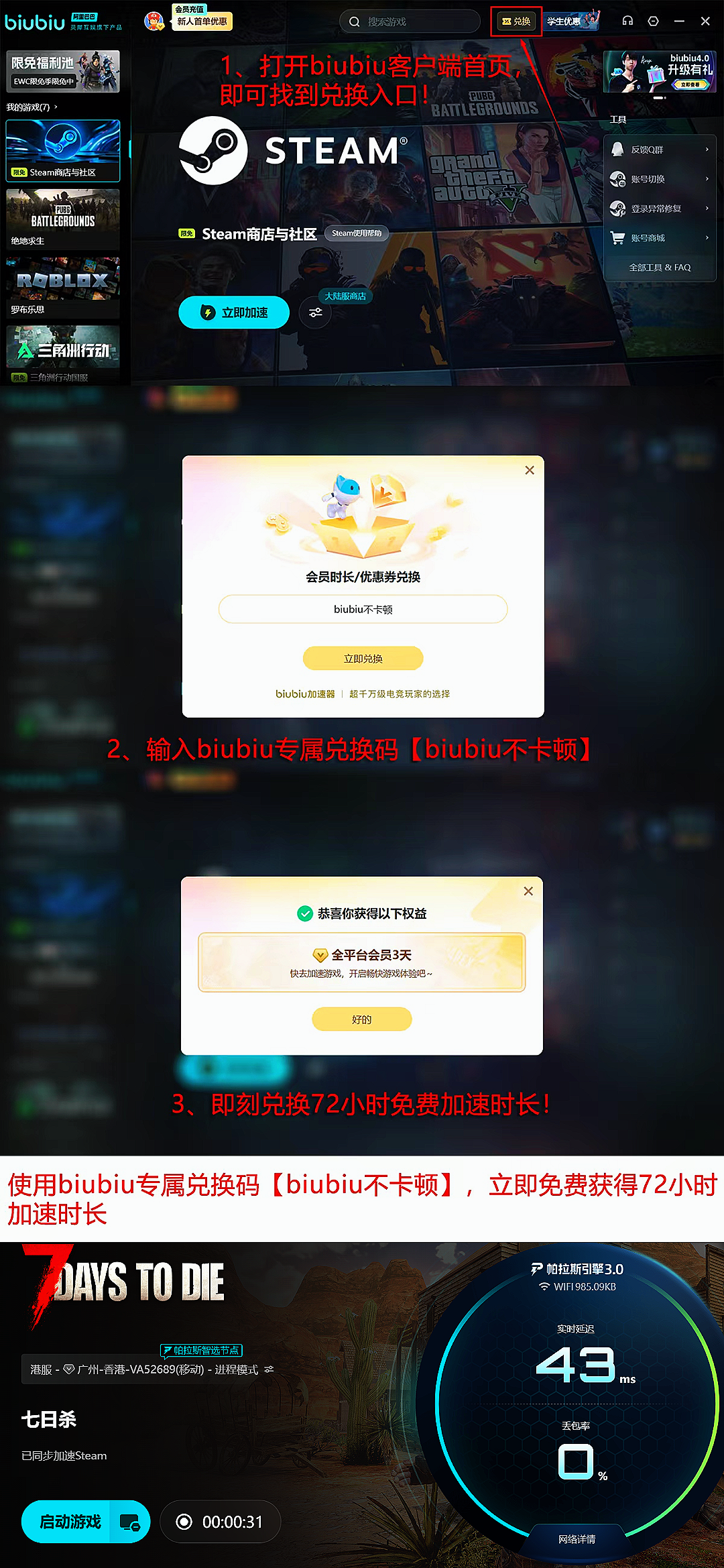 新用户完成基础账号注册后,即可无门槛激活24小时全平台不限速加速权益,覆盖PC端《七日杀》及主流手游,全程零限速、零节点切换限制;所有用户输入专属兑换码【biubiu不卡顿】,还可叠加领取3天专属加速时长。