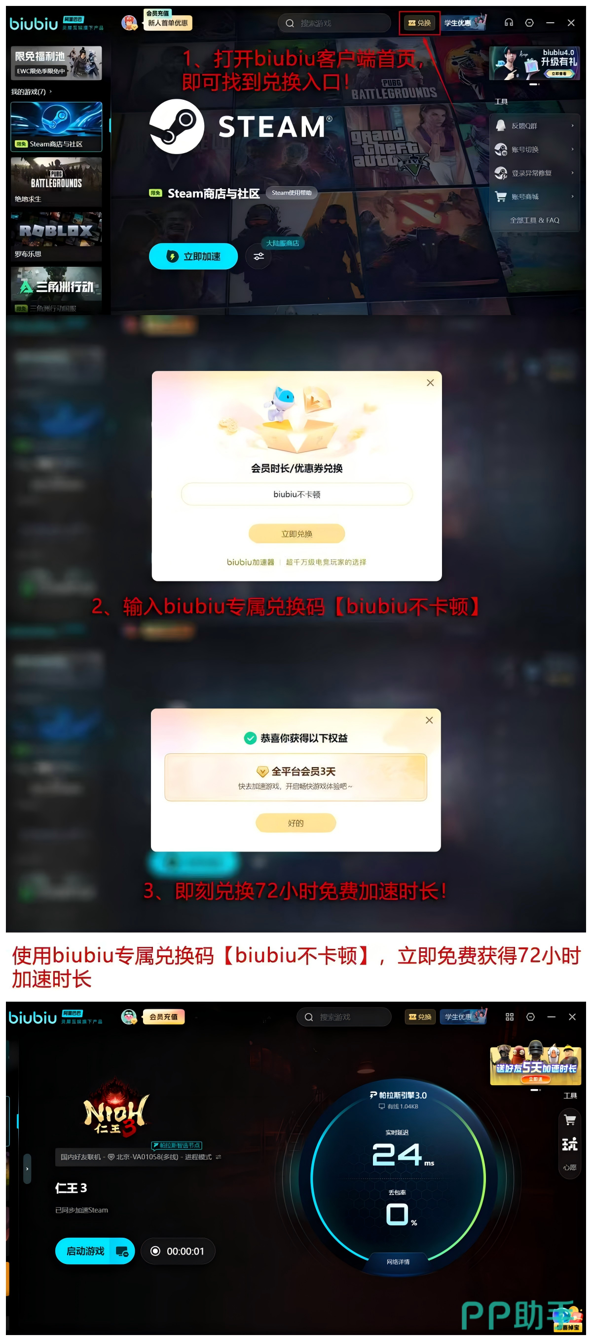 新用户注册后,输入口令【biubiu不卡顿】即可领取72小时高级加速时长;叠加新人专属福利,总计可获得96小时免费使用权限。该权益覆盖《仁王3》全模式,包括剧情推进、试炼场挑战及跨区联机协作,助力玩家快速进入稳定游戏状态。